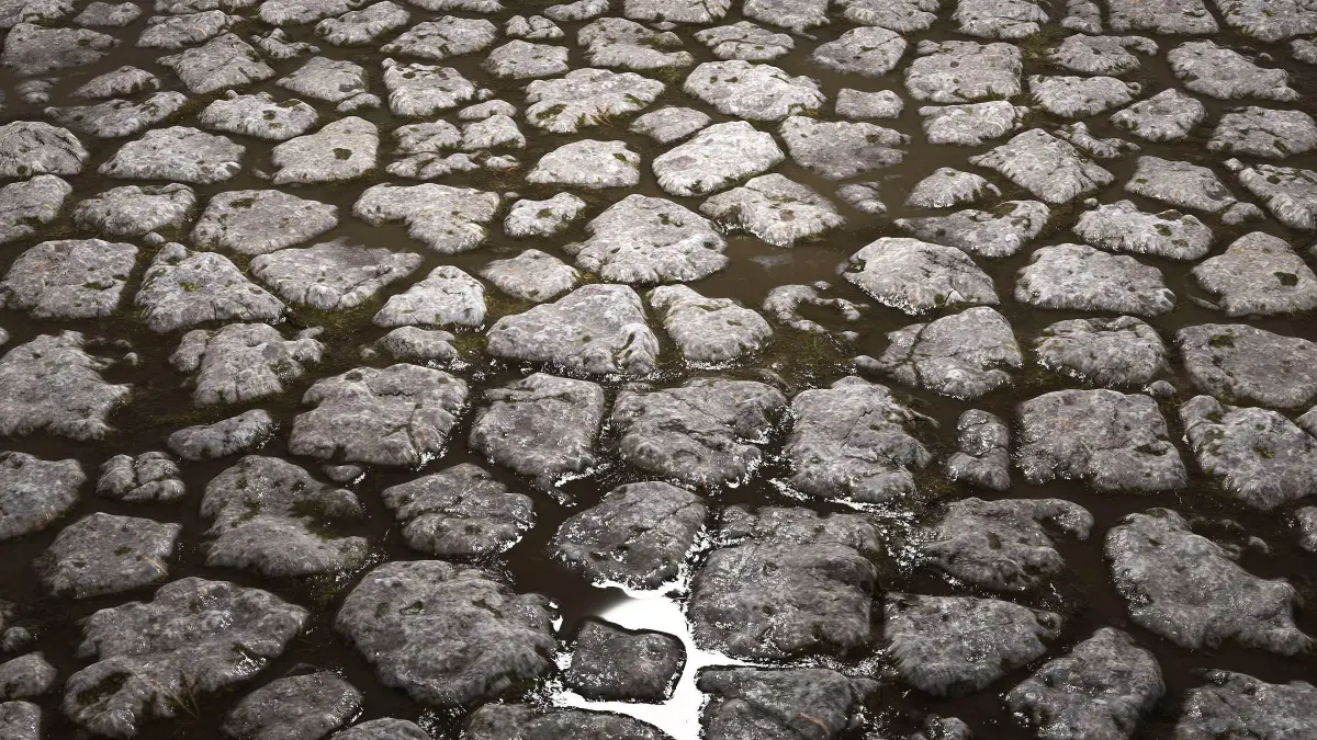 Keywords: cobblestones 8K texture, PBR cobblestone texture, wet cobblestones, mossy cobblestones, apocalyptic cobblestone texture, realistic stone path texture, medieval street texture, seamless cobblestone material, 8K stone pavement, CGHawk textures, game-ready ground texture, architectural ground material, 3D cobblestone surface, photorealistic cobble texture