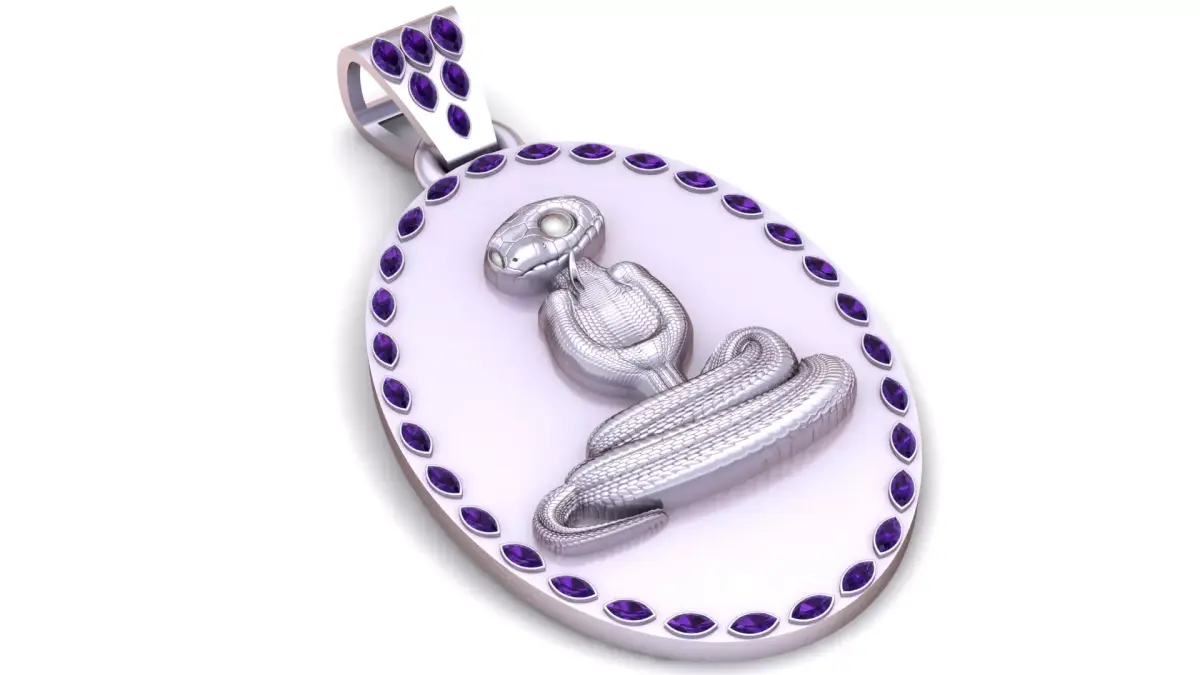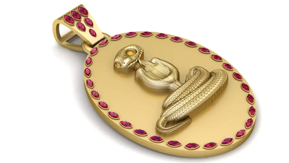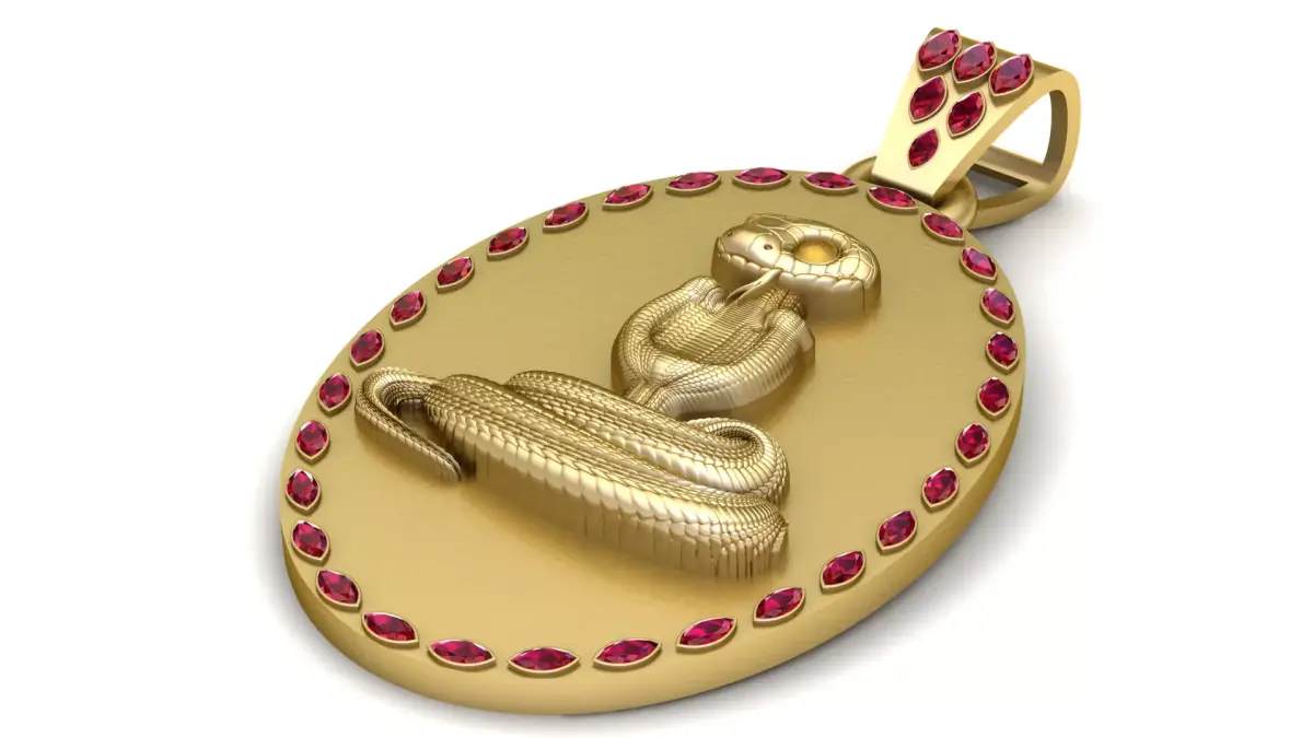 This bold 3D printable Cobra Pendant features a striking cobra with an elegantly coiled body, captured in golden detail. The cobra’s hood and head are accentuated with intricate detailing, and it’s surrounded by a circle of ruby-like gemstones that highlight the design’s luxury. The golden finish and gemstone accents give the pendant a high-end and timeless appeal, making it an ideal choice for fans of snake symbolism or exotic-inspired jewelry.