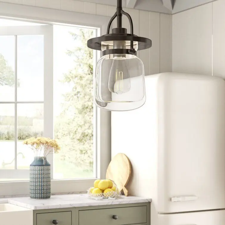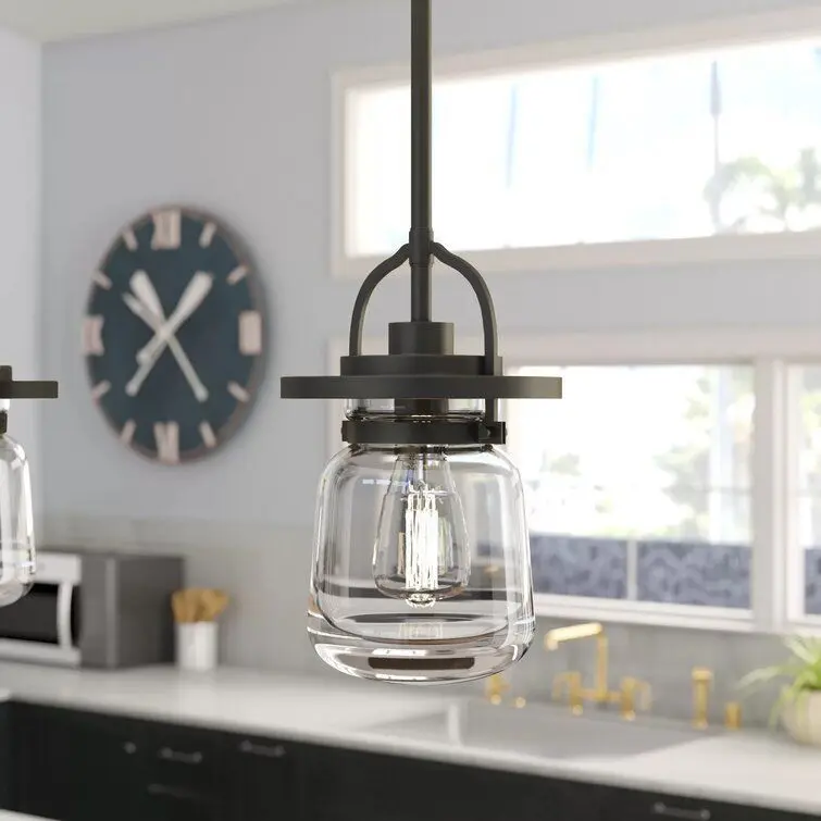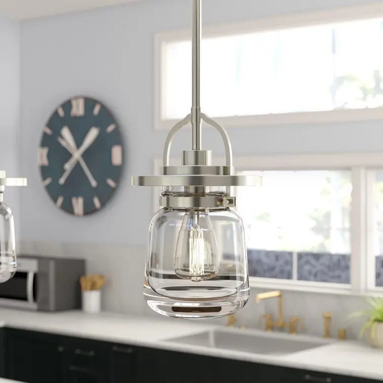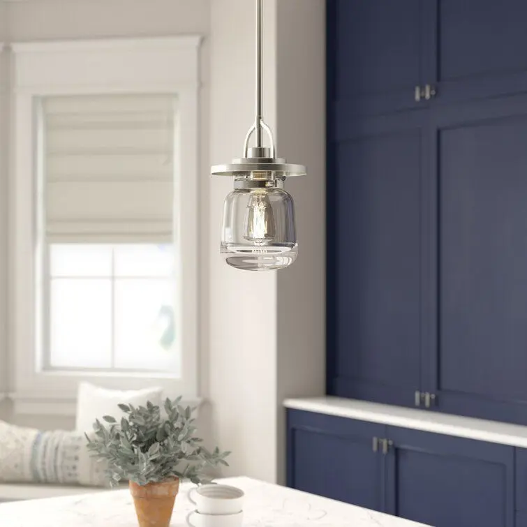 - Add a fresh look over your kitchen island or breakfast nook with this 1-light pendant. Its single jar design is made from clear glass, and reminds us of coastal lighthouses in New England. The rounded steel canopy is compatible with sloped ceilings, and the thin, adjustable downrod with a sleek finish suits the size of any room. We also love that the lantern handle on the top of the jar brings a coastal farmhouse feel wherever you hang. This pendant disperses light from a medium-base bulb up to 100W (not included).