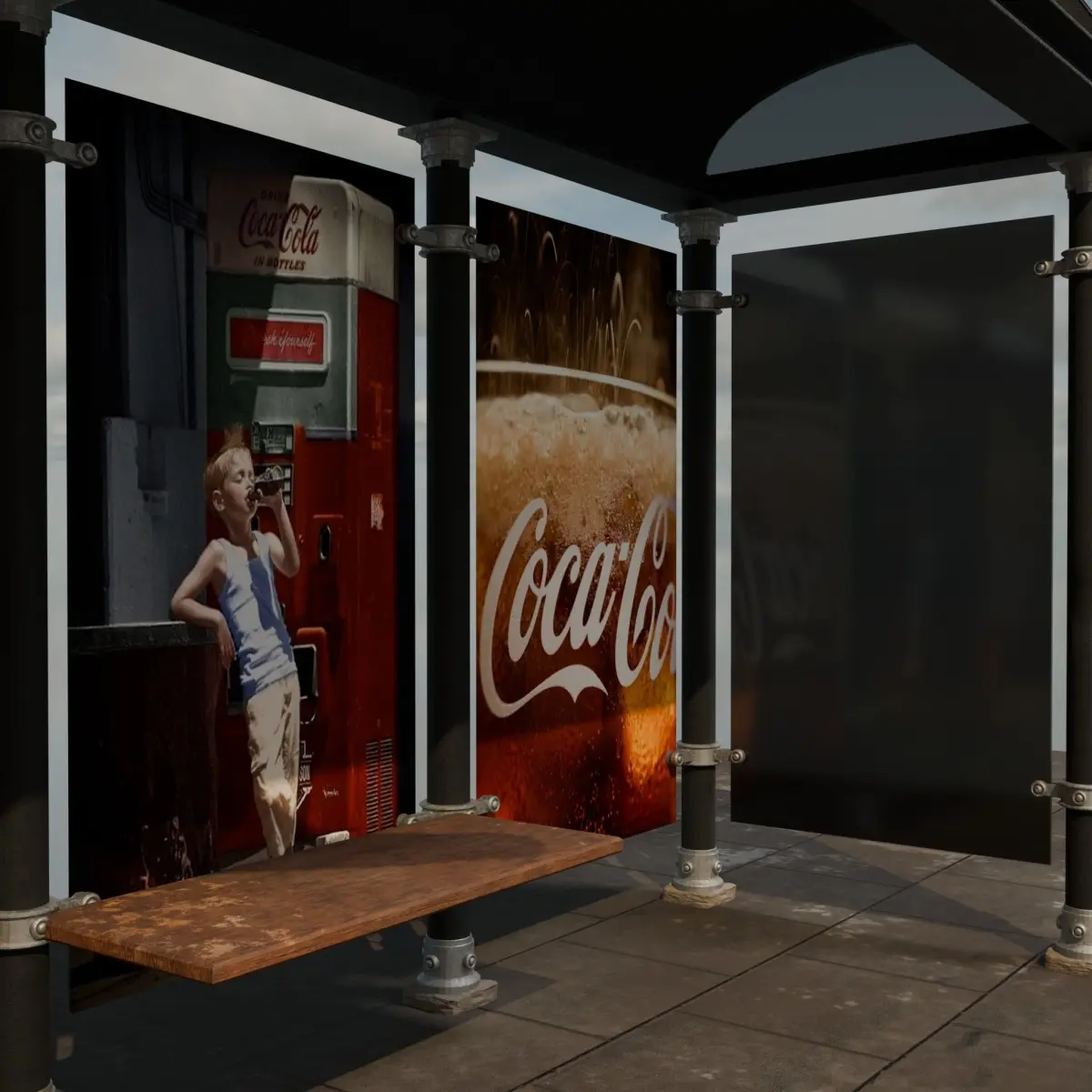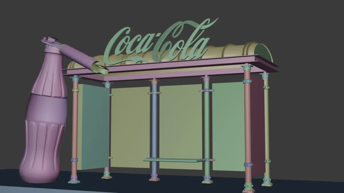 This high-quality 3D model features a creative Coca-Cola themed bus stop designed with eye-catching elements like an oversized glass bottle, a realistic bottle opener, and nostalgic Coca-Cola posters. Perfect for architectural visualization, advertising scenes, or urban props in animation and games. Modeled with attention to detail and optimized for rendering.