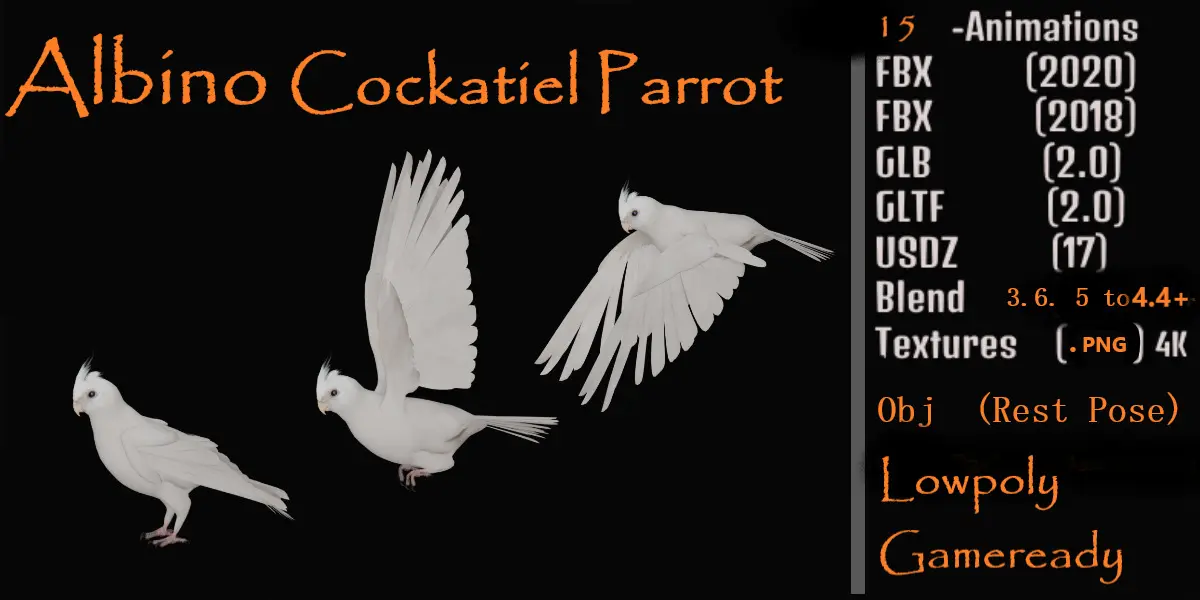The Albino cockatiel, also known as the weero/weiro or quarrion, is a medium-sized parrot that is a member of its own branch of the cockatoo family endemic to Australia. They are prized as exotic household pets and companion parrots throughout the world and are relatively easy to breed compared to other parrots. .3D Albino_Cockatiel Parrot Bird Animal Model By Nyilonelycompany (nyc).