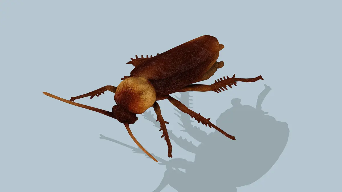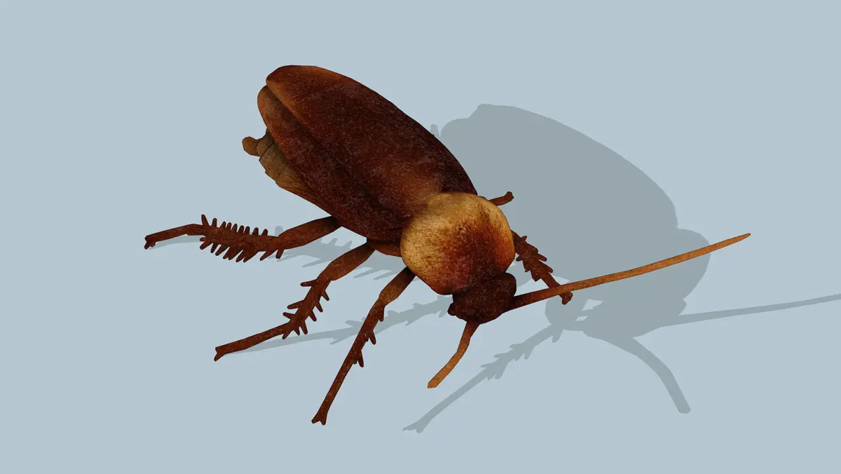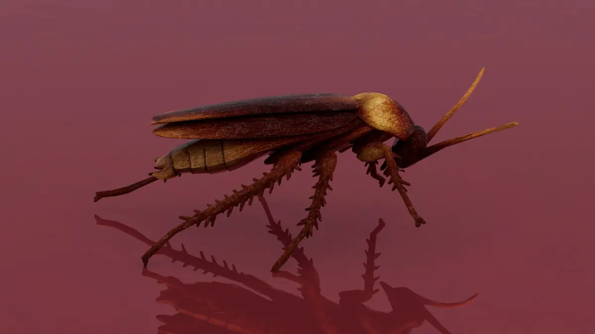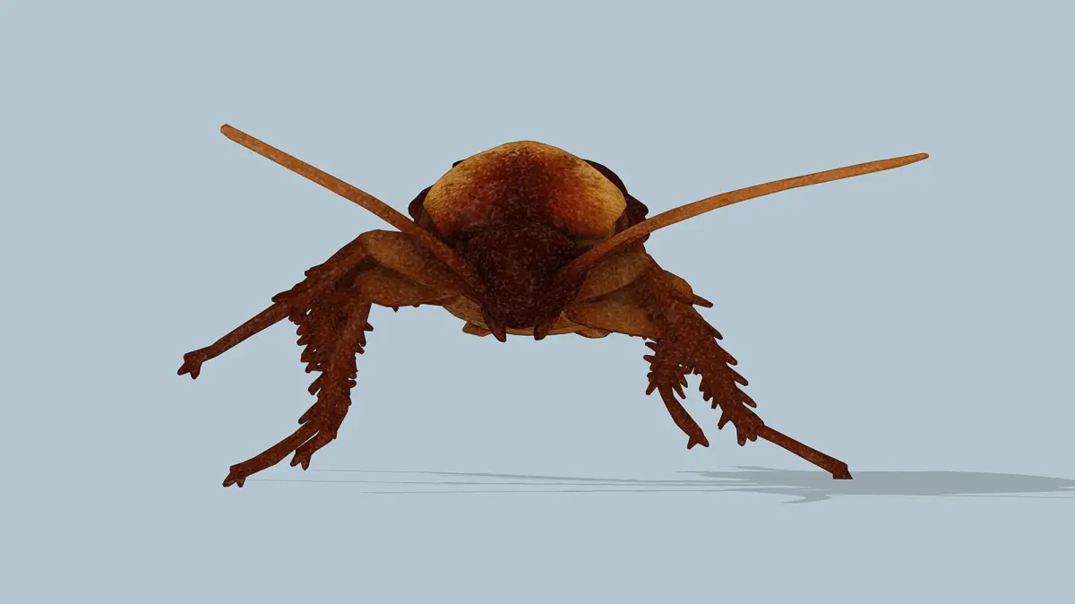This 3D low-poly model meticulously captures the essence of a cockroach. It features a segmented body with a distinct head, thorax, and abdomen, complemented by long antennae and spiny legs. The shield-like pronotum adds to its realistic depiction. The model emphasizes realism, replicating the insect's exoskeleton texture and form.
