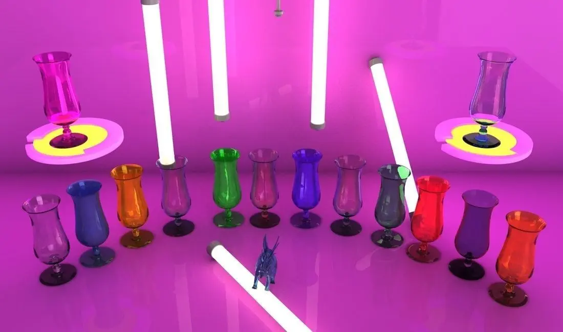 photorealistic 3d barware cocktail colourful models, Stylish and elegant, royal modern glass set. Also 2 dragon - dino (cartoon dinosaur) 3D models are included with this set!