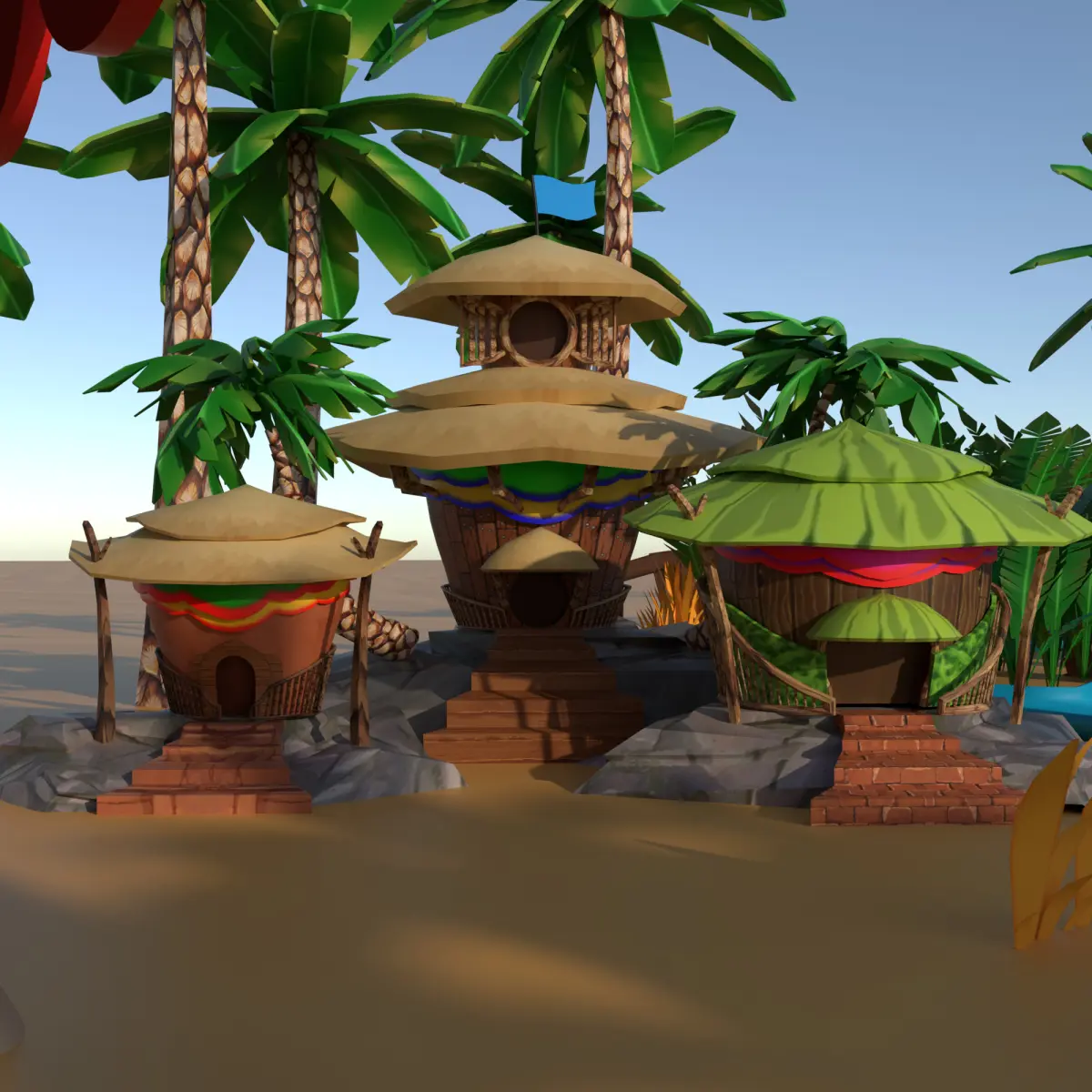 Step into a tropical dream with Coco Oasis Village, a stylized 3D environment pack perfect for games, animations, or educational projects. This vibrant desert oasis is centered around a detailed tropical structure with lush palm trees, a flowing irrigation system, and a fully modeled vegetable farm – a true paradise in the sand!