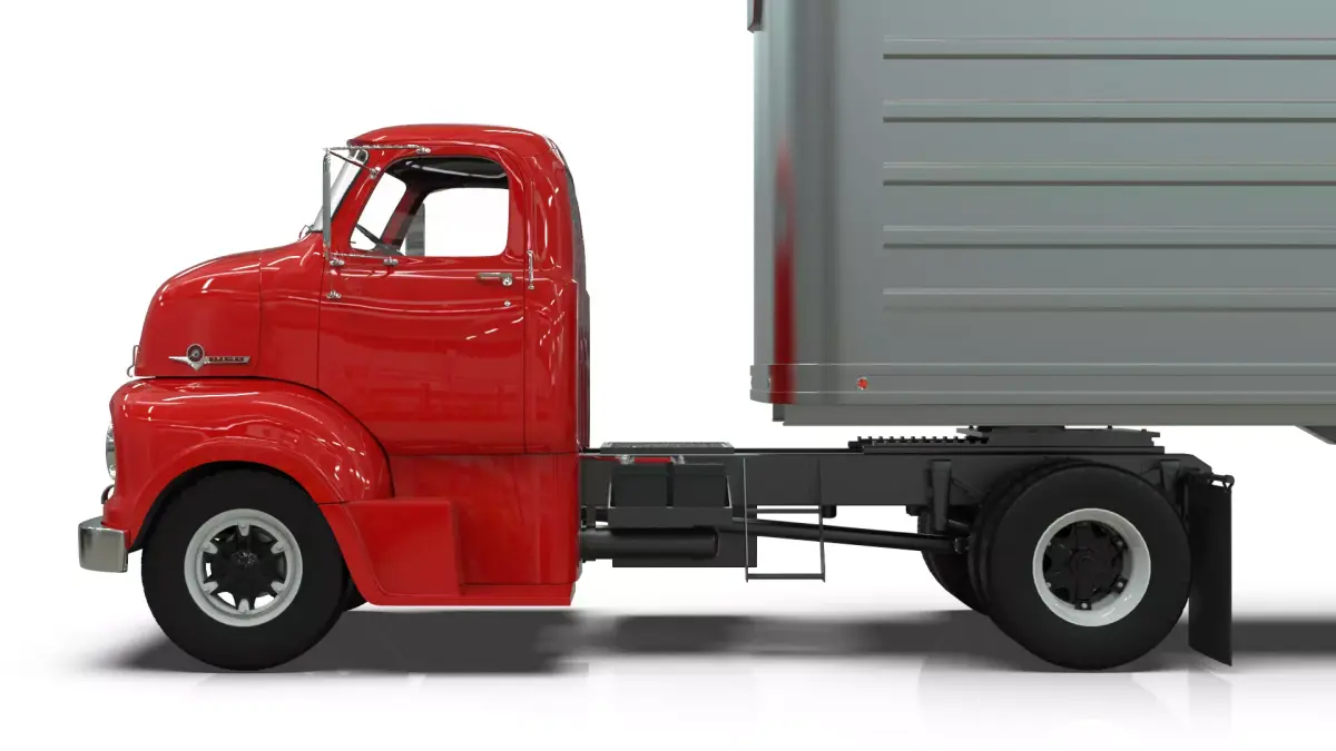 This is a 3D model of a classic 1950s-style COE (Cab Over Engine) box truck with a single axle. It was meticulously modeled in Blender using blueprints to achieve a close-to-reality appearance and is specifically intended for use in digital projects.