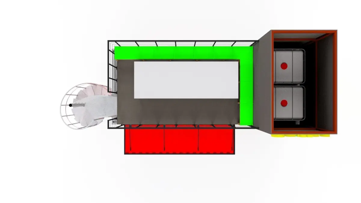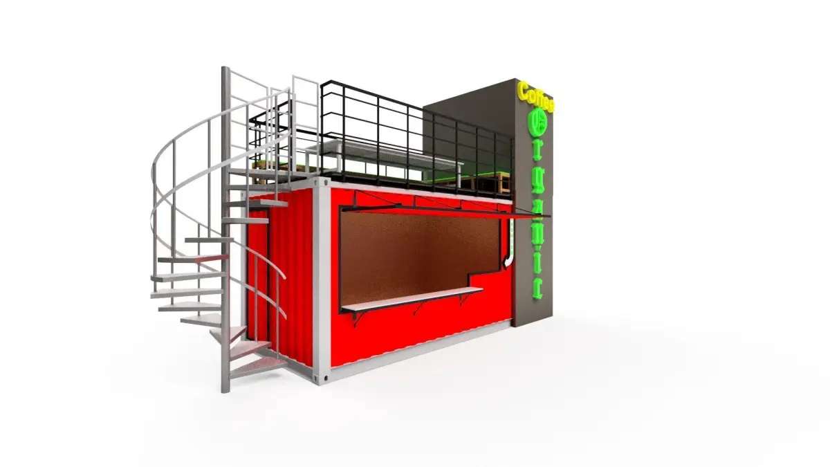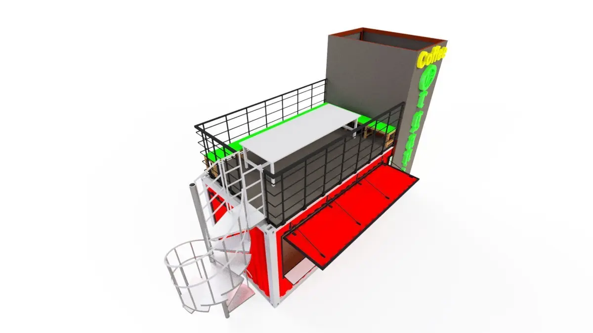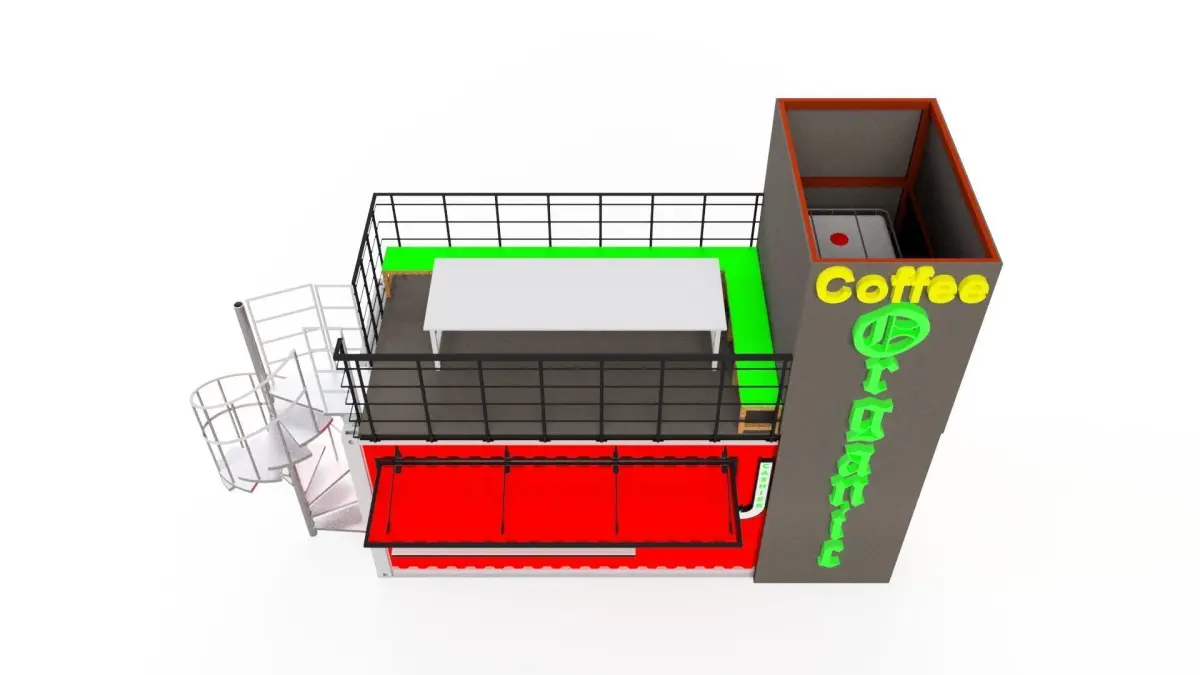 coffee container with two bathrooms, two water tanks and a spiral staircase that leads to a food area that sits on top of the container
