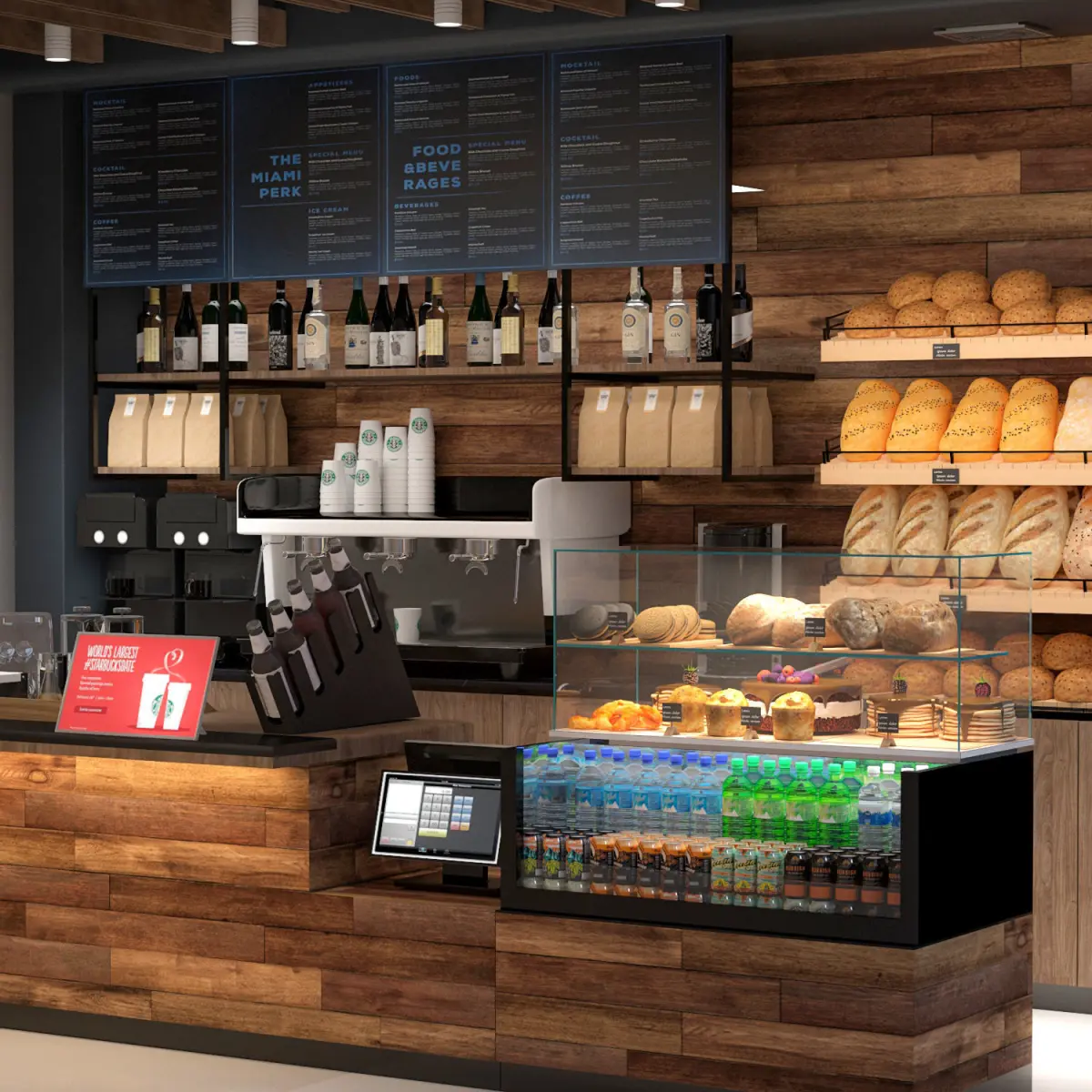 A Coffee Shop Counter with full equipments and decorative base on Starbuck interior...