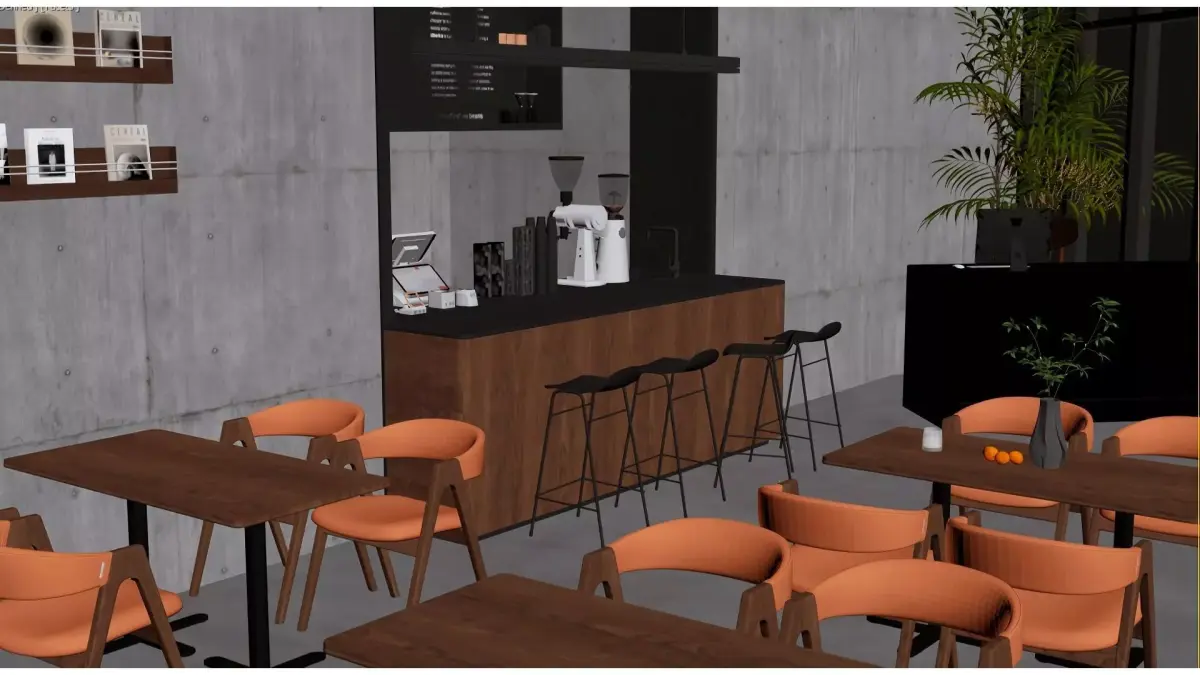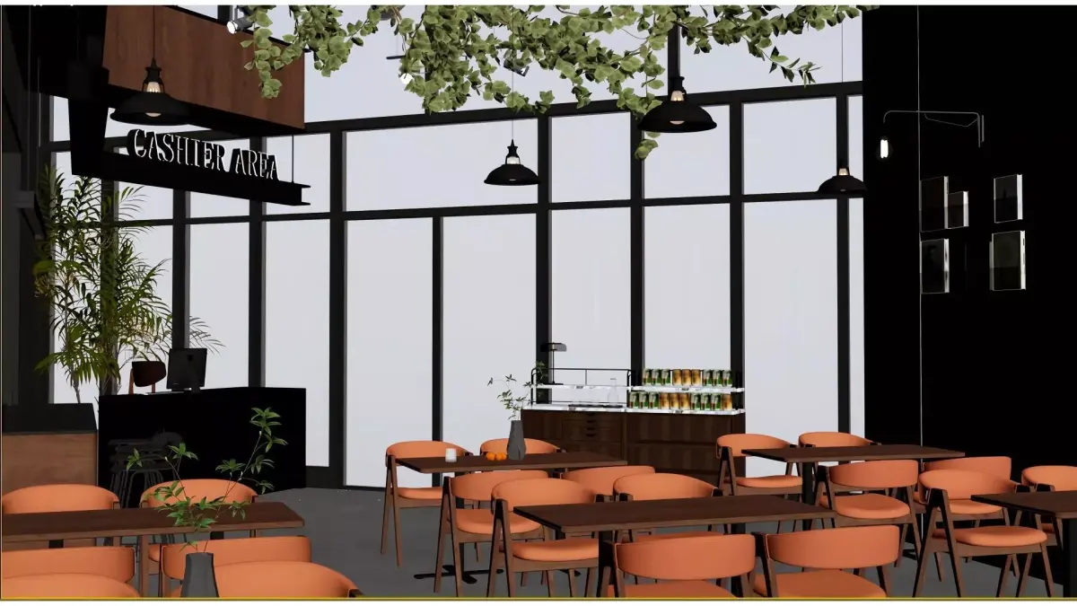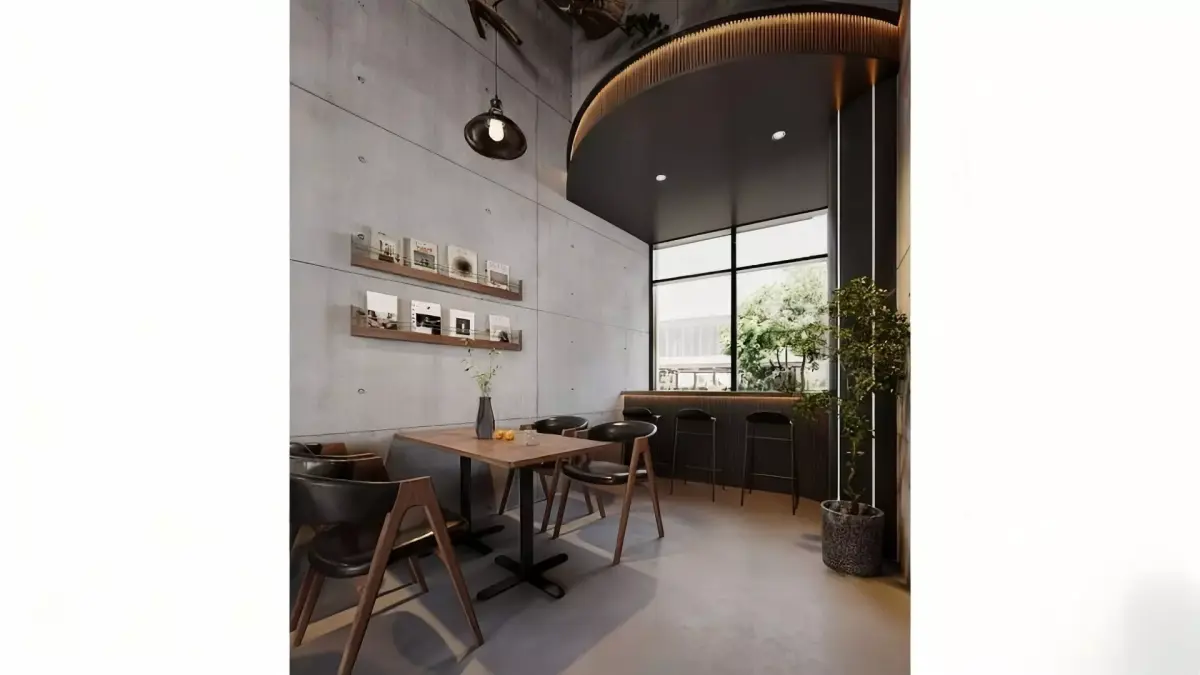 This is a café space blending industrial style with forest aesthetics: it features cement-textured walls and exposed pipes paired with wooden tables and chairs, while simulated tree branches and green plants on the ceiling create a natural atmosphere. The bar area clearly divides the coffee-making zone from the cash register area. Wall-mounted display shelves and minimalist light fixtures add a relaxed, casual vibe. The overall style is modern yet embraces natural comfort, making it suitable for leisure and light social occasions.