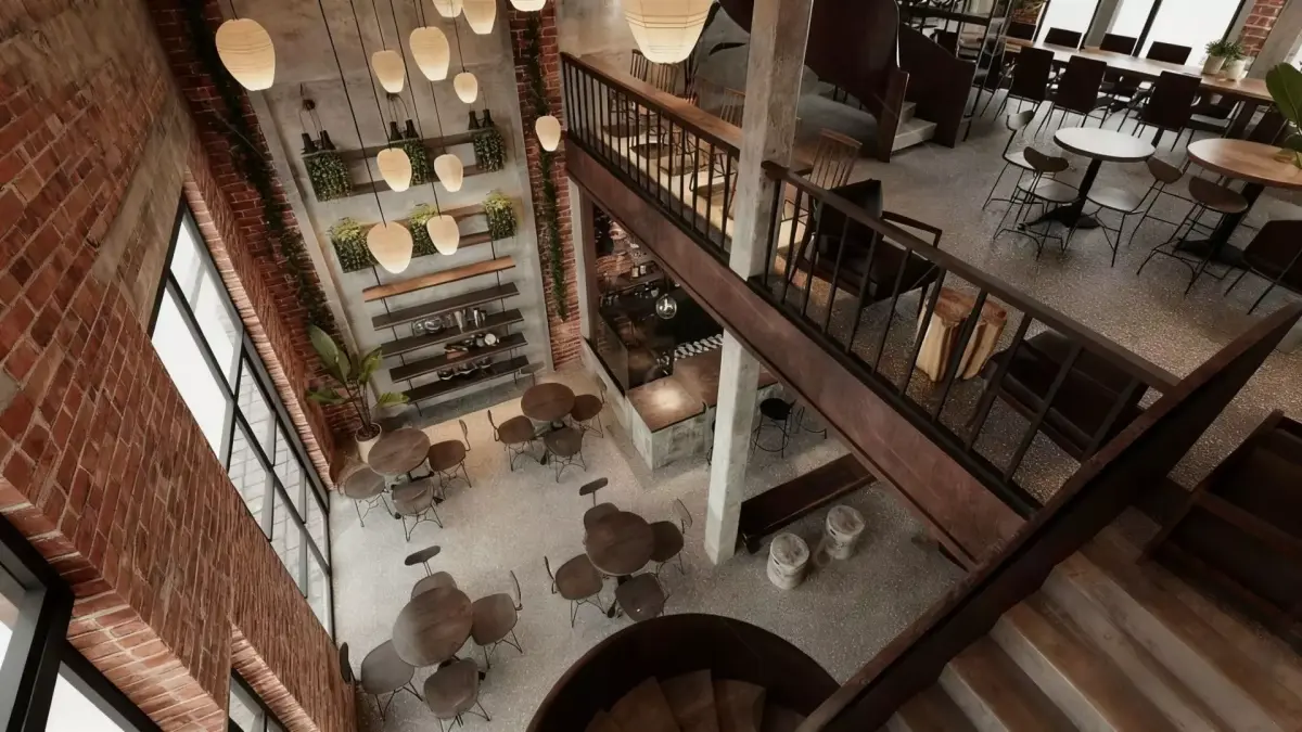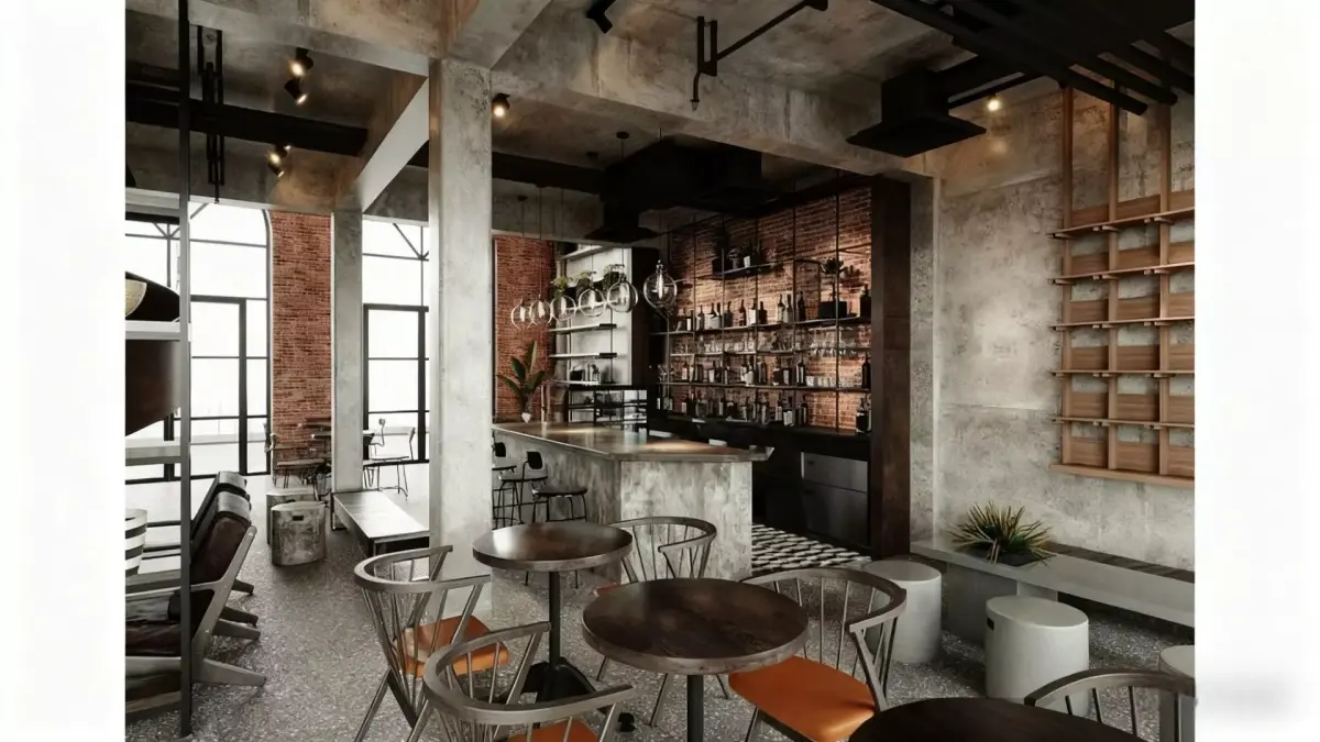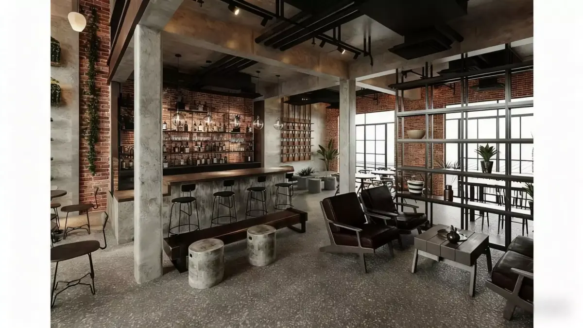 This is an industrial loft-style catering space (which can function as a café or a bistro). It is built on a base of rough materials such as concrete, red bricks, and metal. To soften the cold and rigid feel, wooden furniture and hanging green plants are incorporated as complements. Meanwhile, elements like an open bar counter, a double-height area, and transparent glass partitions are integrated into the design. This not only preserves the retro texture of industrial style but also embodies the transparency and sense of relaxation characteristic of modern catering spaces.