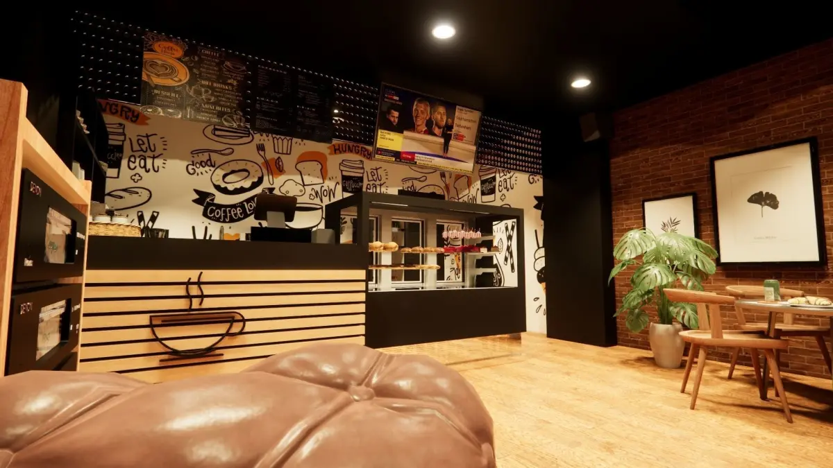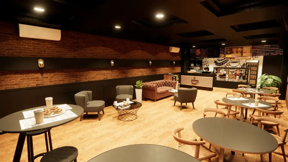 Modern coffee shop space. Dimension: 14.9m x 5.3m This file has no protection. It is a modern-styled coffee space ready to render with V-ray or Enscape software. One will find FBX files that can be imported into various modeling applications, such as Maya, 3ds Max, SketchUp, and Blender.Inside the file, one will find multiple materials, light setup, and camera angles that can easily be adjusted or changed to personal taste. This file does not have any protection. You can reuse the scene, the render settings, the lights, and the materials, but above all you can learn from the file, moving inside the project, observing how the light was created and handled, how materials are developed, what is the role that every texture play within them, and the values that fill every single option.