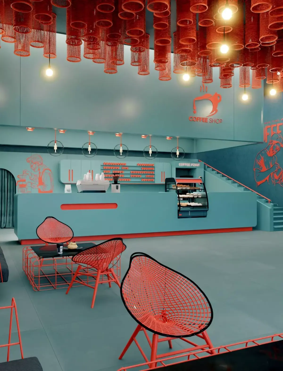 Add a touch of elegance and boldness to your visualization projects with this modern coffee shop interior design, combining a unique teal and coral color palette that gives the space a refined and contemporary atmosphere.The scene is carefully crafted with realistic lighting and clean geometry, making it ideal for architectural visualization, interior design projects, or promotional renders.