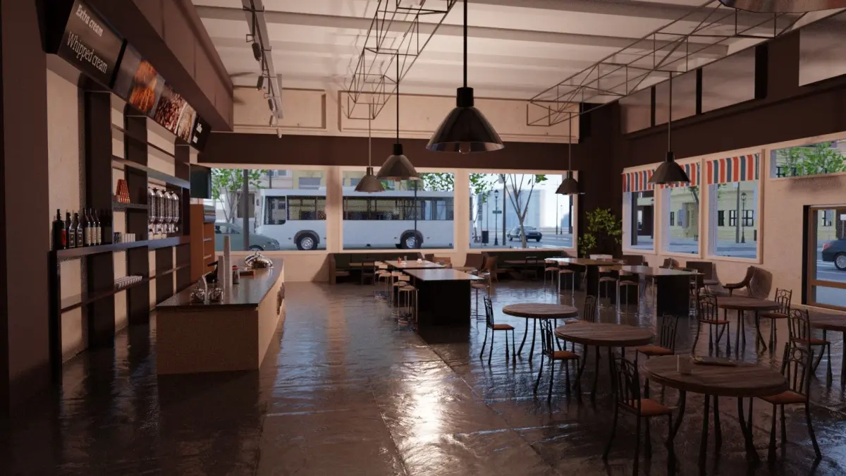 - The interior has five different types of tables and chairs, two types of couch, a bookshelf with books and plants, all the props that you would find in a coffee shop like; coffee mugs, plastic cups, coffee cups, plates, dishes, drinks and bottles (all with custome made and designed textures).