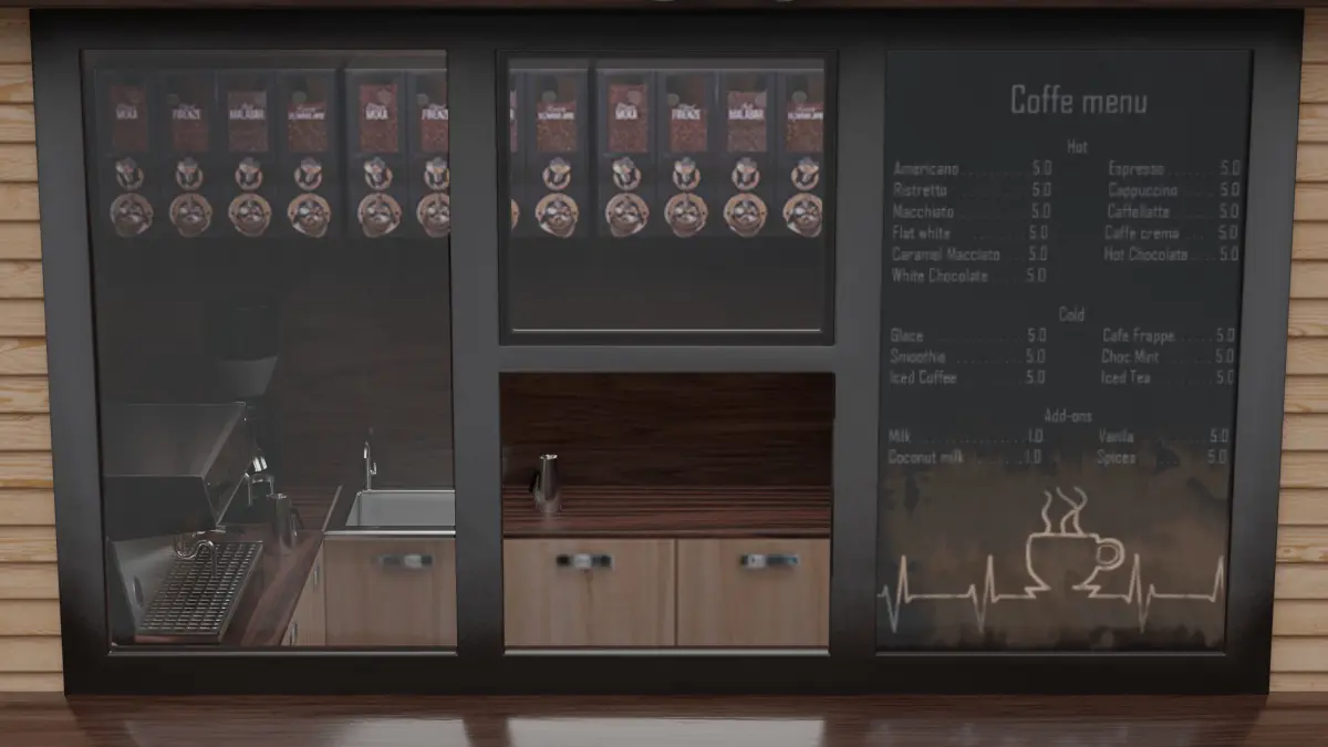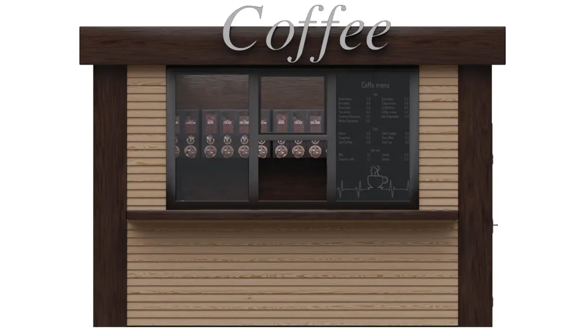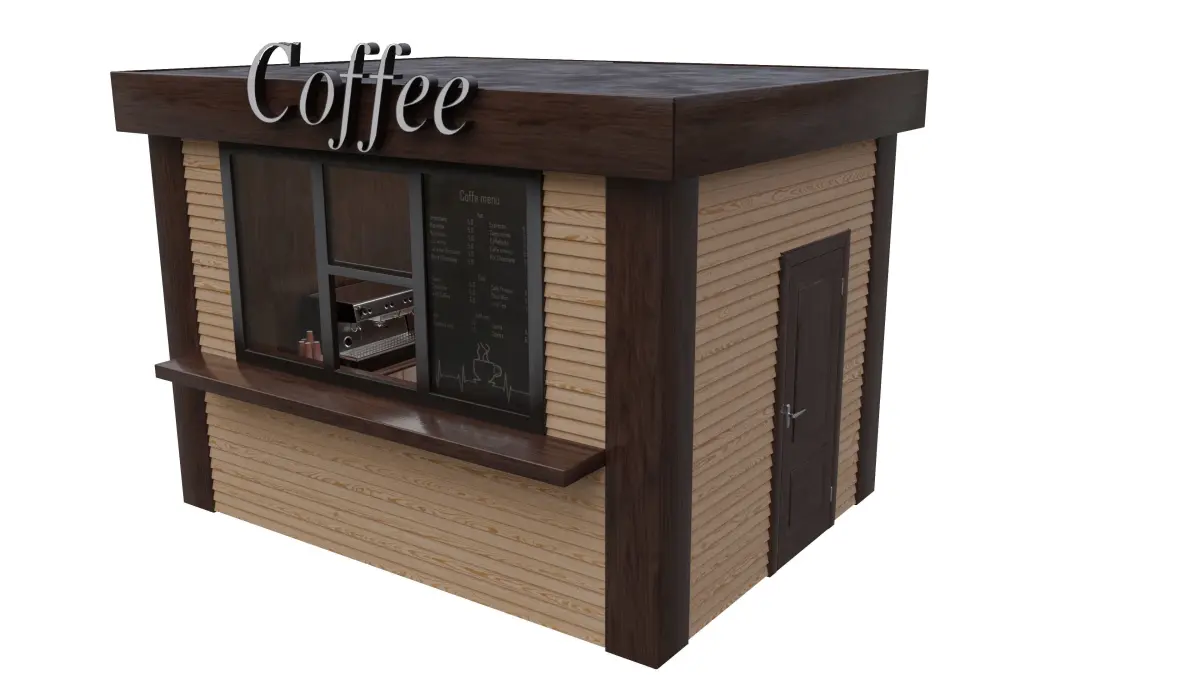 Street coffee shop. The model includes a coffee shop with tables and chairs with 4k textures. Interior furnishing elements (coffee machine, coffee grinder, refrigerator) with 1k textures.
