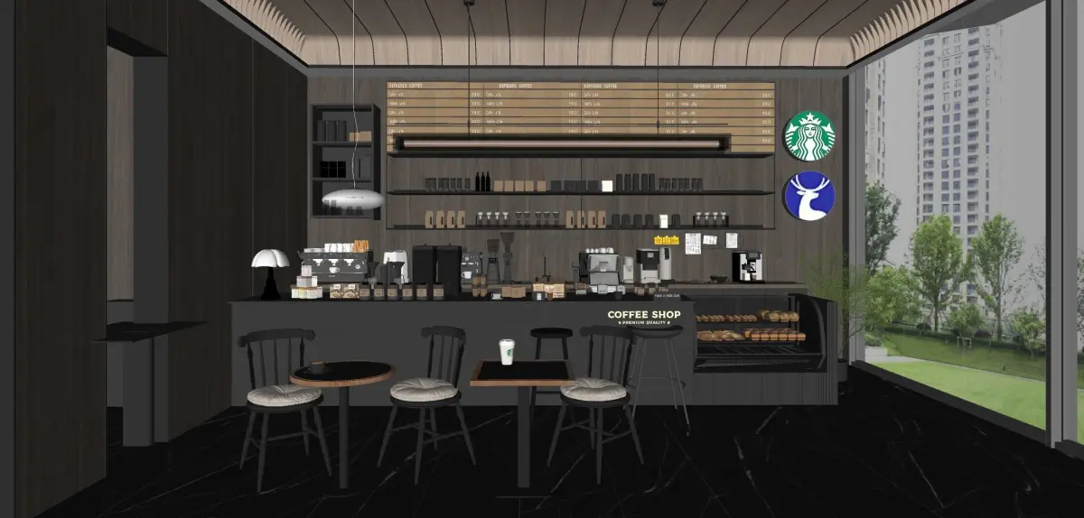 Atmosphere CreationDark wood walls, marble floors, and metal lighting fixtures, combined with green plants, create a calm and delicate industrial-luxury vibe, highlighting the professionalism and quality of the coffee space.