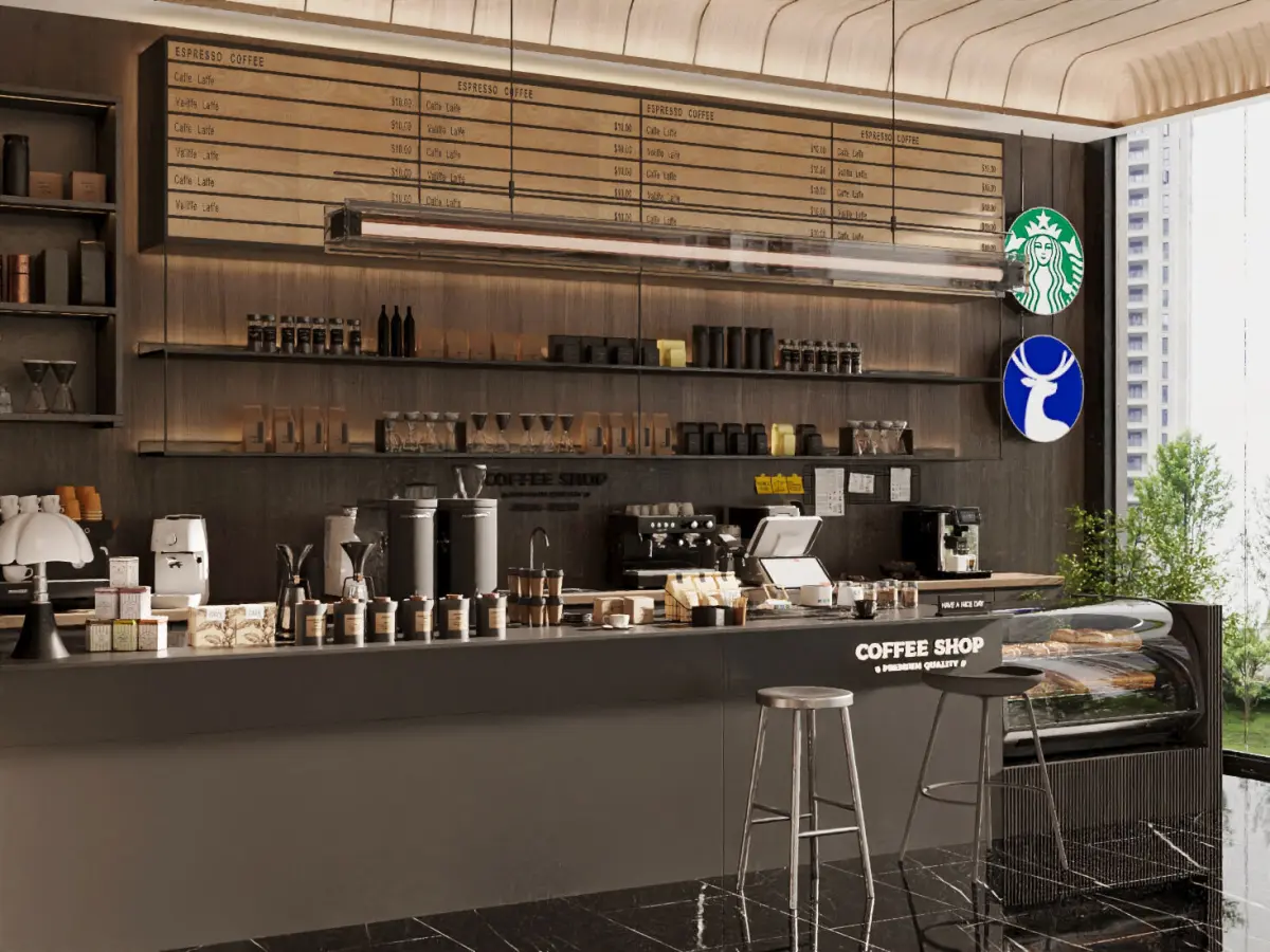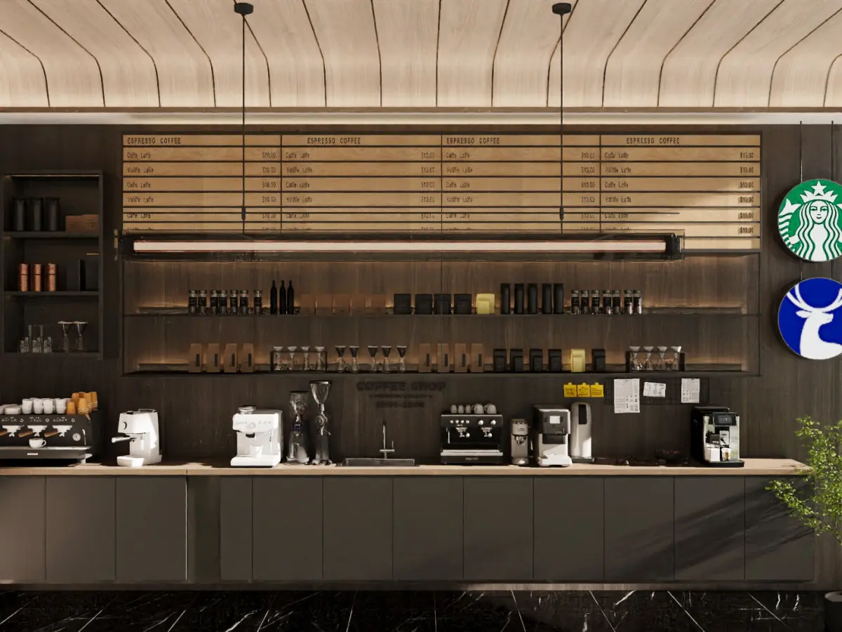 This is a modern-style coffee shop space design that presents a professional and stylish business scenario: