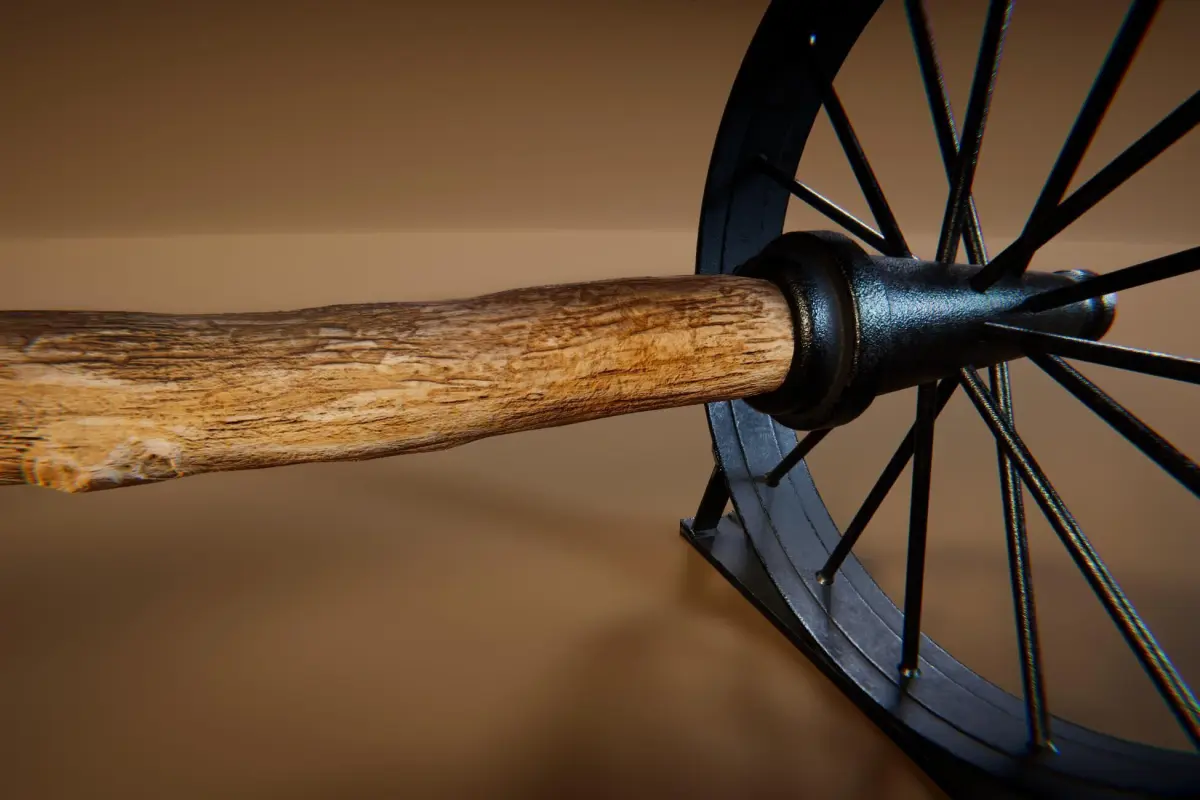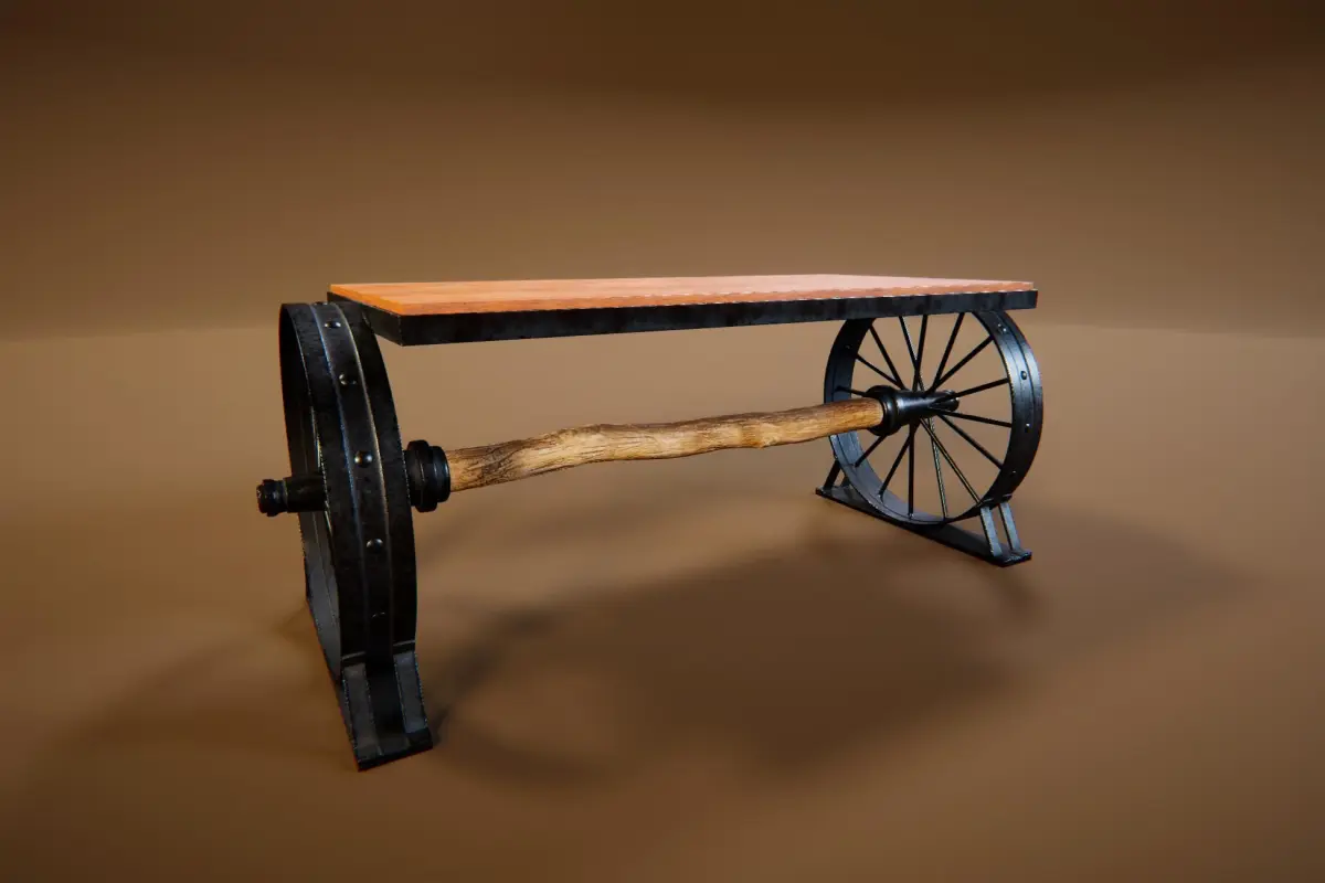 Combining a solid wooden tabletop with iron-rimmed wagon wheels and a hand-carved wooden axle, this unique environment prop captures the spirit of vintage machinery and rural craftsmanship. The heavy iron structure and worn wood finish offer an authentic weathered look, making it ideal for stylized lofts, rustic interiors, or thematic game environments.