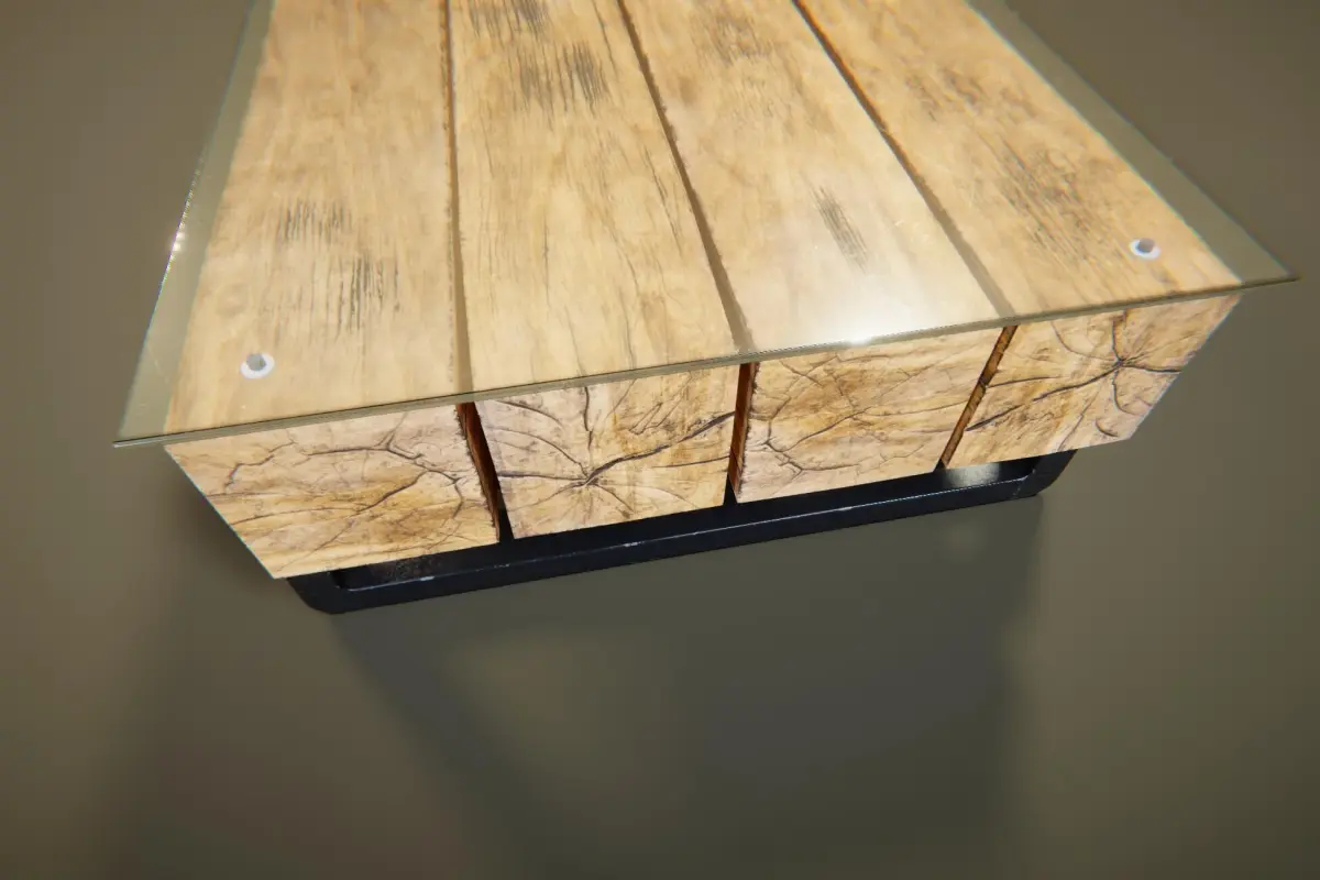 Built from solid cross-cut wood blocks and enclosed by a crystal-clear glass surface, this environment prop combines natural texture with a modern edge. The scorched end grain detailing, blackened metal base, and precise glass fittings add to its visual weight and realism.