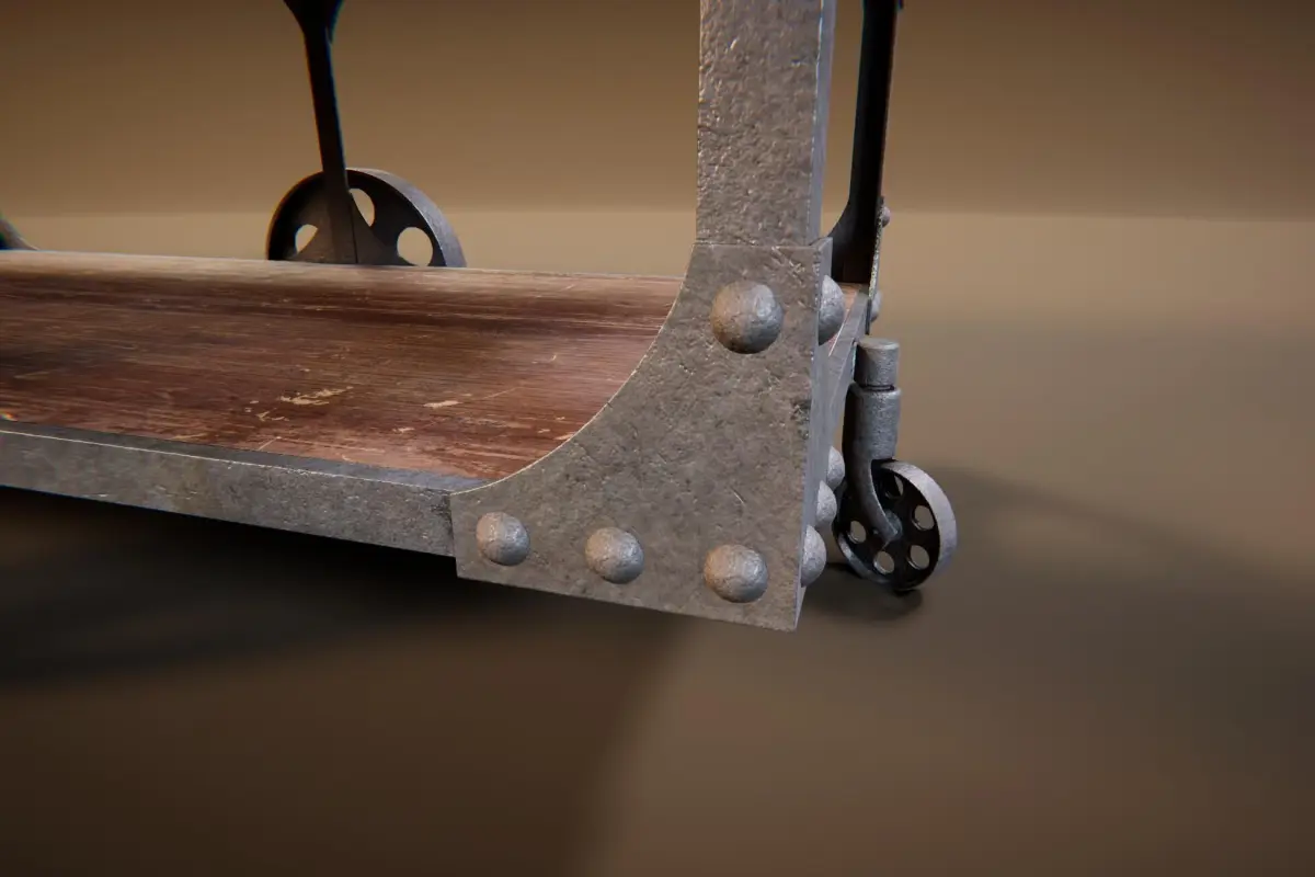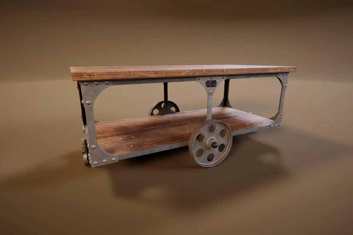 Built with a worn wooden surface and a rugged metal frame, this low-poly model features large spoked wheels and functional-looking rollers, making it ideal for factory-inspired environments, loft apartments, or vintage-style cafés. Scratches, rivets, and detailed weathering bring realism and texture, while the lower shelf adds visual and structural depth.