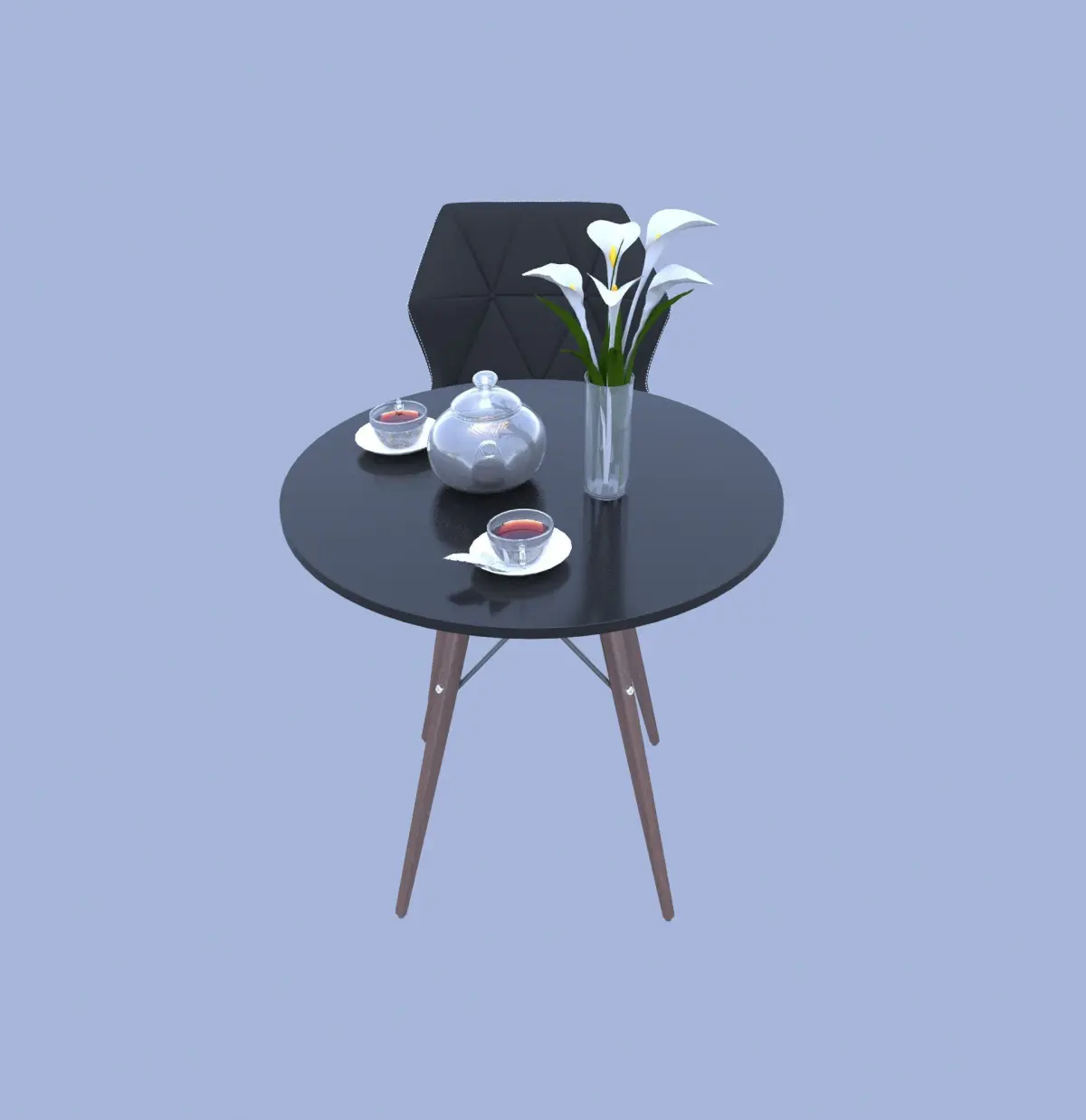 Round dining table: a modern round table with a dark gray or black table top that has a matte texture. The table is supported by four sophisticated wooden legs that diverge down, giving it a light and elegant appearance. The table diameter is ideal for two people, creating an intimate atmosphere.Design chair: a comfortable and stylish stool with a dark gray or black seat and back. The seat upholstery has a unique geometric stitched pattern that adds textures and modernity. Gentle wooden legs with metal connections in the form of a grid provide stability and attractive appearance.Tea service: a detailed kettle with a metal glare, as well as two elegant tea cups with saucer, ready for use in your stage.Decor: a vase with two realistic white flowers of calves that add life and freshness of the composition.Model features: