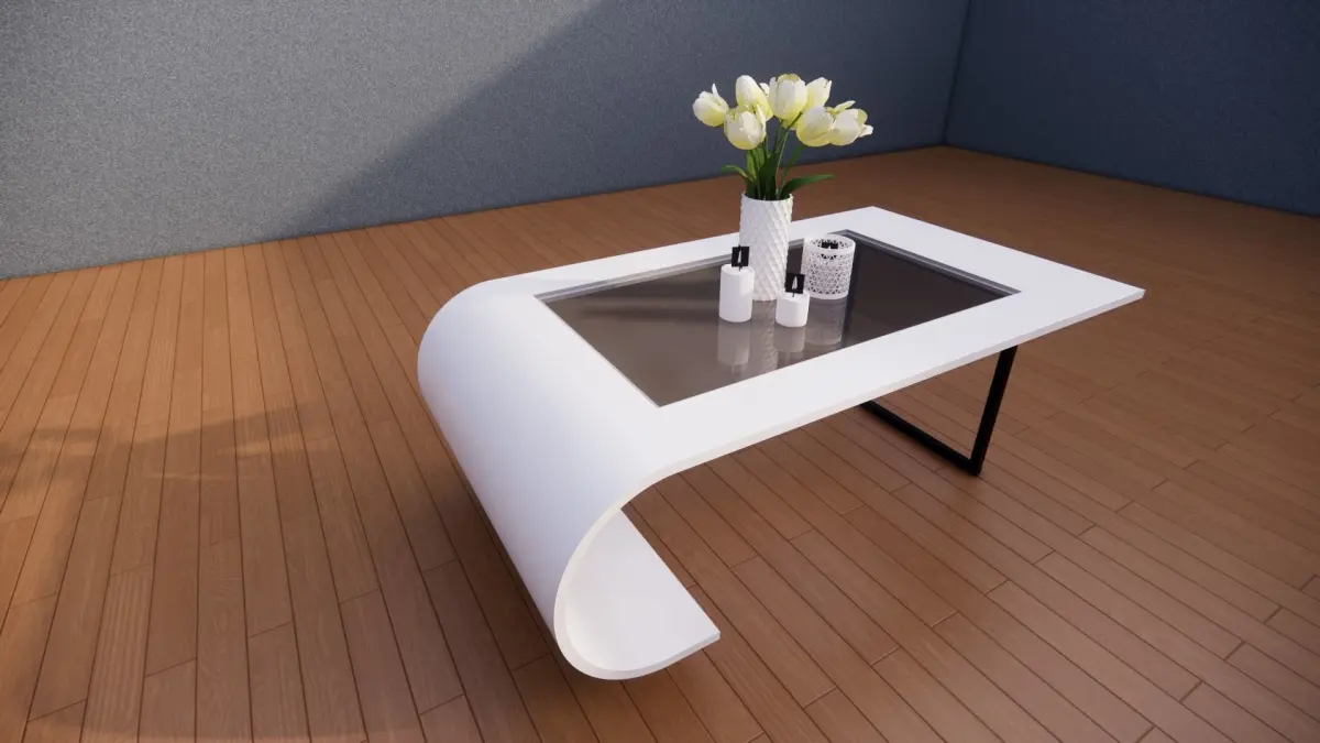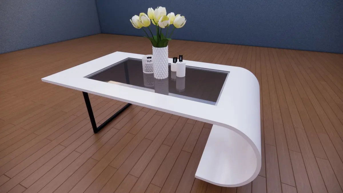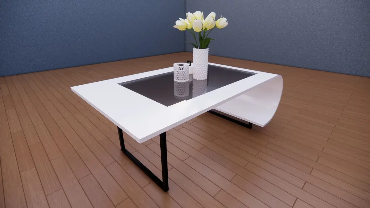 Minimalist coffee table build with the combination of three mateials including fiberglass as the main top, transparent glass to be fit in the top fiberglass and stainless steel is used a supporting componints which help the table to keep on standing.