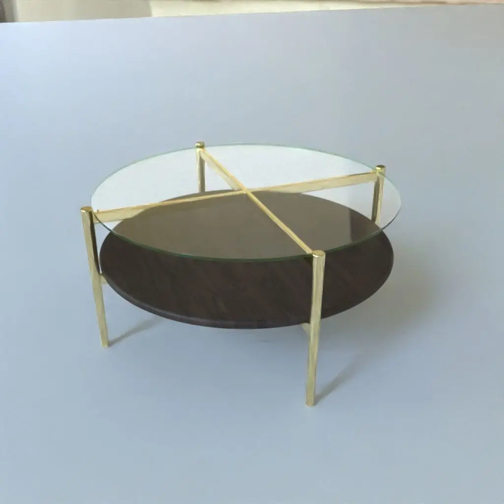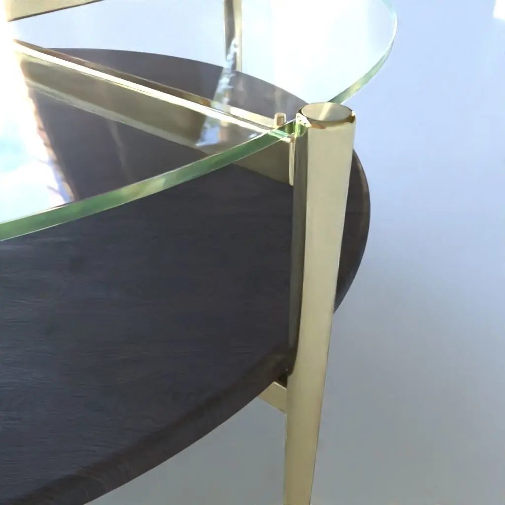 86 cm diam. x 44 cm h.Tempered glass top.Wood veneer over an engineered wood bottom shelf covered in a Cloud finish.Metal frame in an Light Bronze finish.Imported.Patent pending.