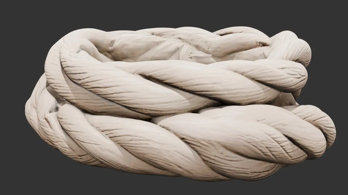 This realistic 3D model shows a thick coiled rope bundle laid on a wooden plank surface. The fibers are modeled with high detail to reflect natural rope texture and weight. It’s perfect for dockside, ship deck, blacksmith, or workshop scenes. A flexible asset for realistic environmental storytelling in both stylized and photorealistic scenes.