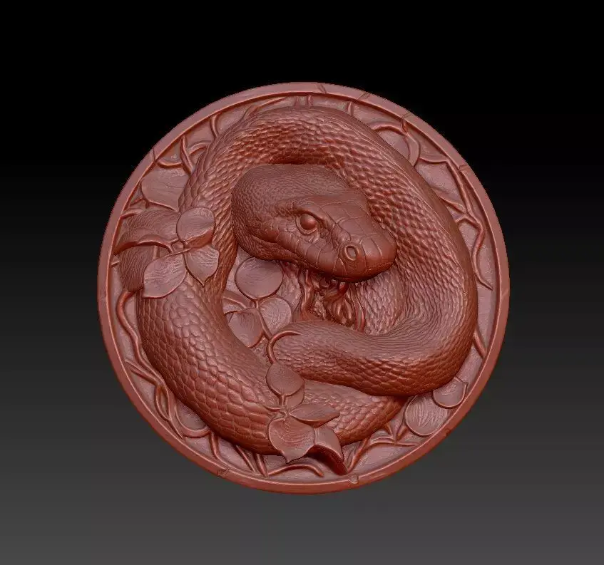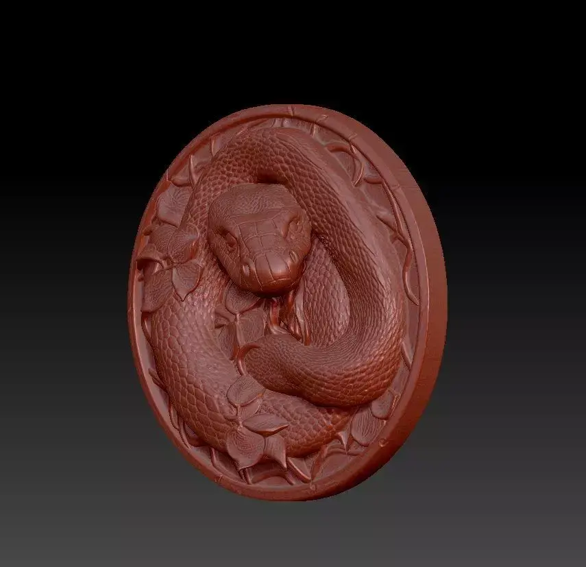 Highly detailed bas-relief medallion featuring a coiled snake surrounded by leaves. Perfect for jewelry design, CNC engraving, or artistic 3D printing.