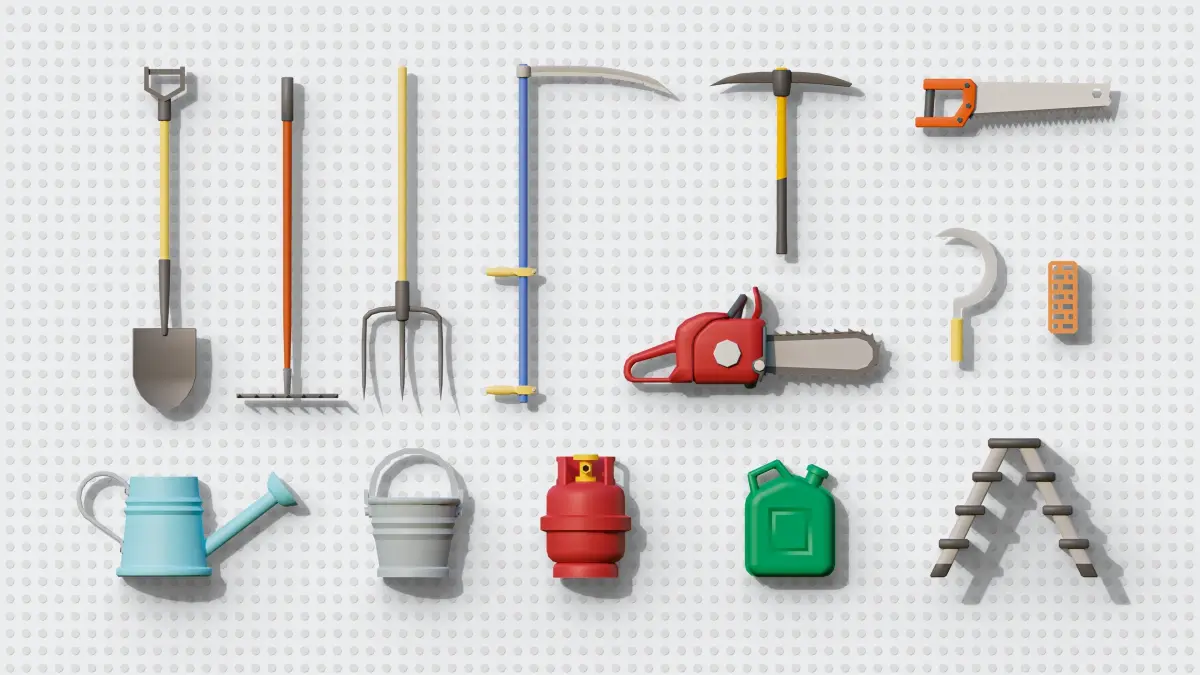 PACK CONTENT - Farm Equipment (x11): Bailer, brick, bucket, chainsaw, sickle, hack, hayfork, rake, scythe, shovel, wood saw.