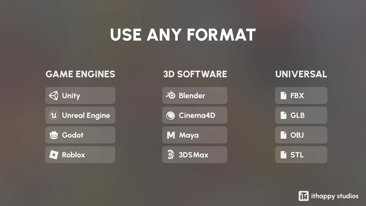 FILESYou’ll be able to download formats such as Unity Package, UE, Blender, C4D, Maya, 3DSMax, FBX, OBJ, GLTF, and STL.