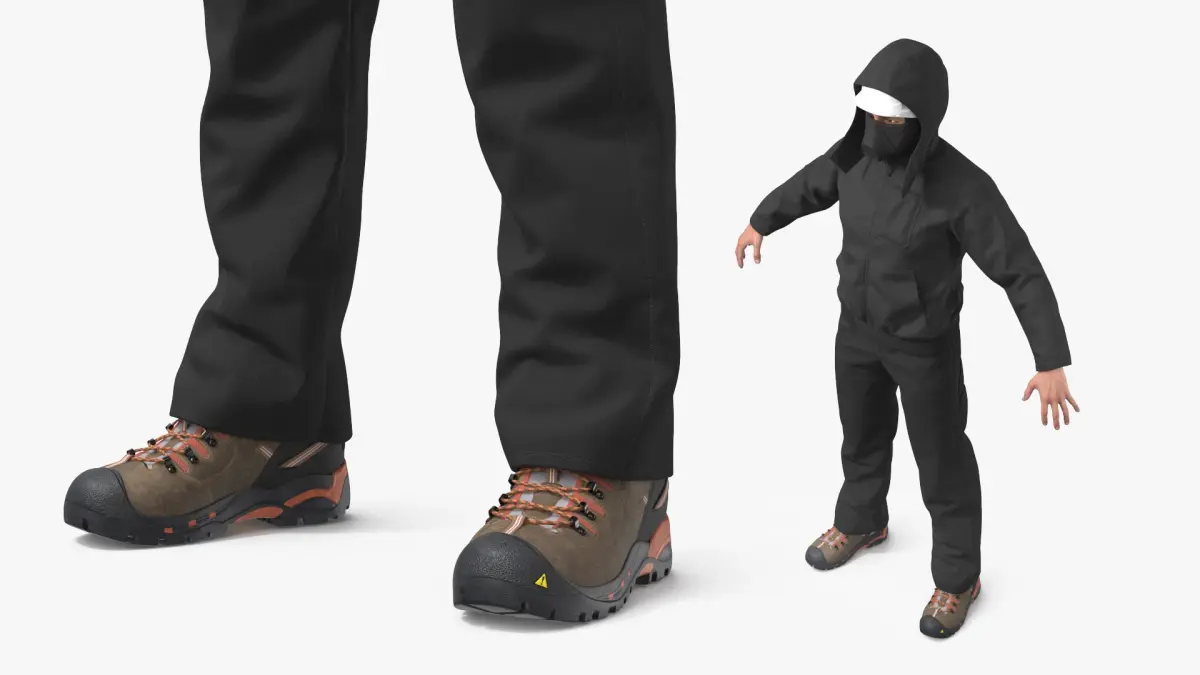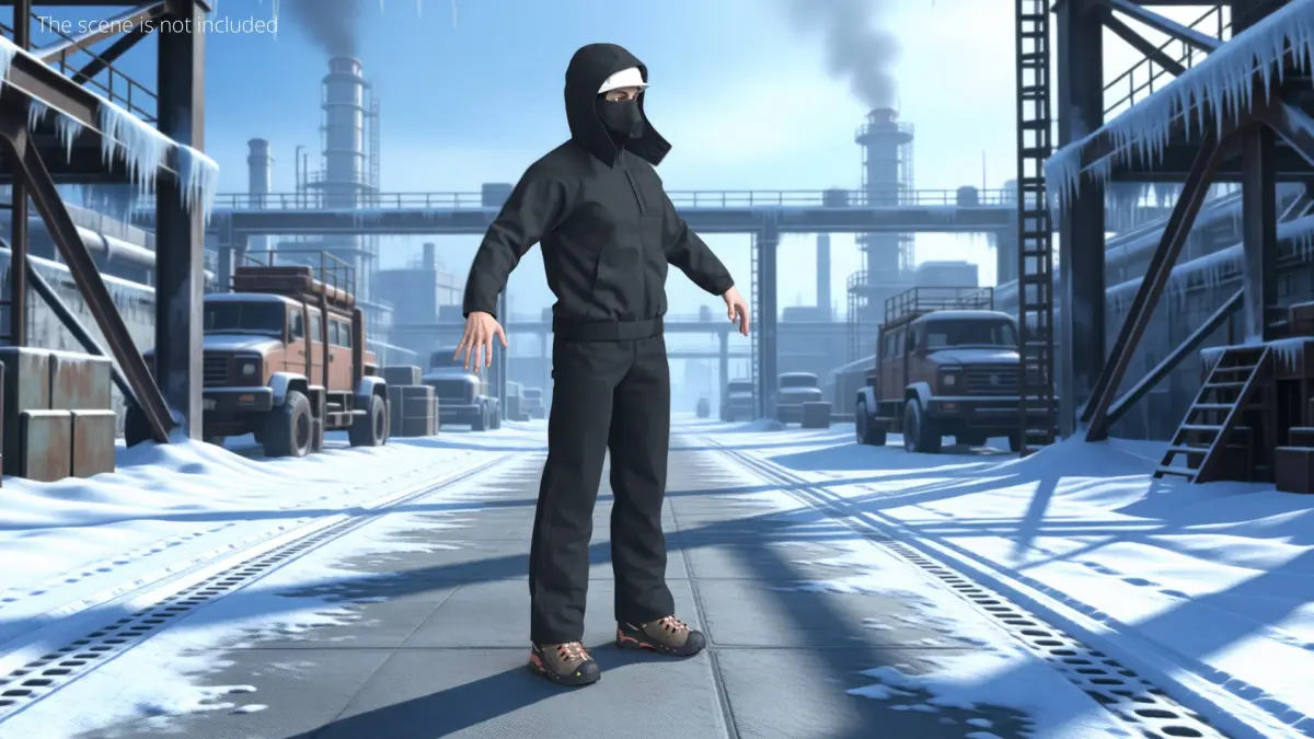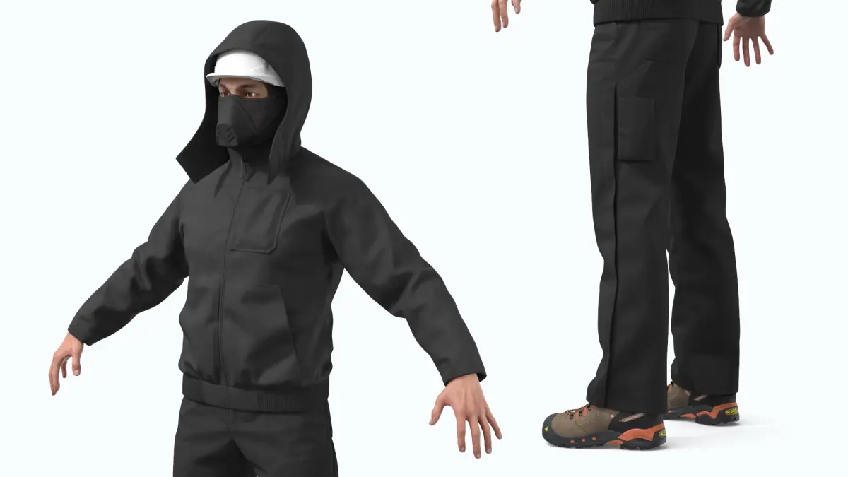 Cold Weather Work Outfit on Man Black is a three-dimensional model of builder character with a cold-weather clothing ensemble designed for demanding outdoor labor.