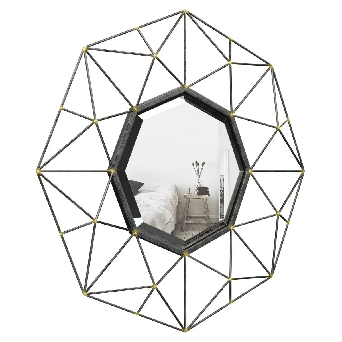 This modern 3 dimensional spindled wall mirror features an octagonal mirror centerpiece with a bold black geometric frame and antique gold tips for a touch of glam. Suspend this sculpture over a sofa or align as the apex in an eclectic frame gallery. Antique gold tips will vary piece to piece for one-of-a-kind feel.Features