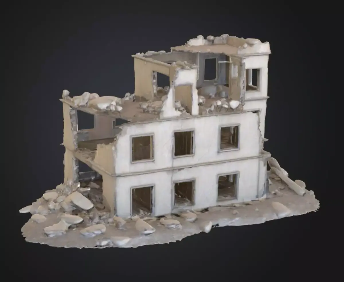 Three‑story collapsed concrete building 3D model with cracked surfaces and rubble piles. Ideal for disaster scenes, war simulations, survival environments, or cinematic renders. Optimized geometry and realistic PBR textures included (FBX/OBJ formats).