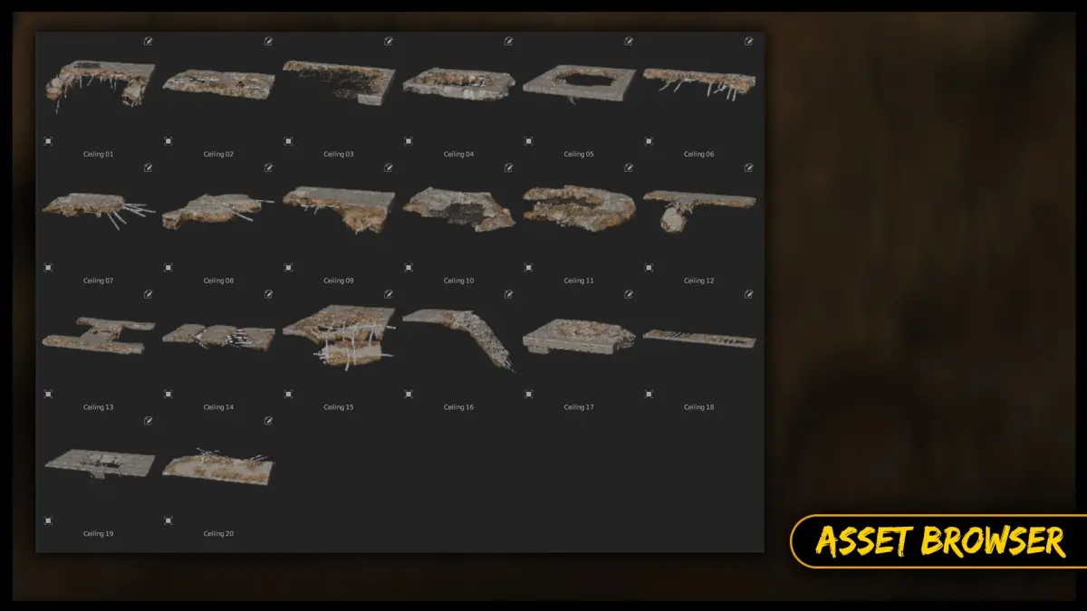 This Volume contains Collapsed / Damaged Ceilings and Slabs inspired by The Last of Us Franchise, but they can be used in a War or Abandoned Themed Designs too.