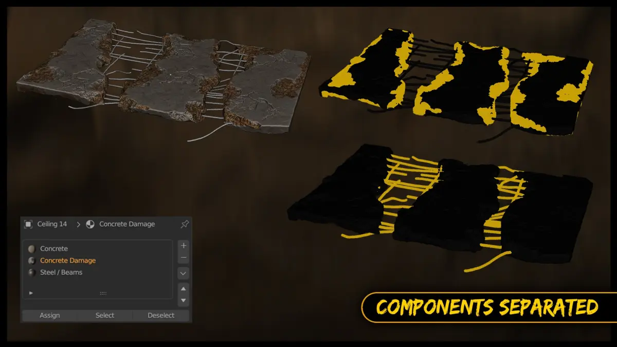 All Meshes Are Dense Triangulated Meshes, all 3D models are Textured, 3D Models components like Steel, Damaged Parts..etc are Separated By Textures, so you can select and assign your own materials easily and they are all unwrapped using Blender's Smart UV project.