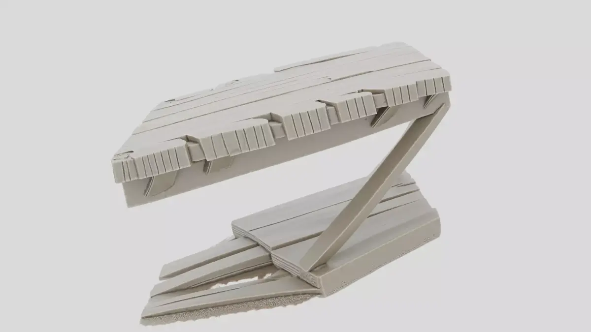 This collapsed wooden bridge section 3D model is intended as thematic terrain for tabletop wargaming environments. The design features broken beams, uneven planks, and structural damage that suggests a destroyed or abandoned crossing. The model is completely static and created for 3D print use only. It contains no textures or materials and is fully ready for 3D print, allowing hobbyists to finish it with paint and effects. The geometry is solid and reinforced, ensuring durability during printing and gameplay handling. This terrain piece is ideal for fantasy, medieval, or post-apocalyptic battlefields, serving as difficult terrain, visual storytelling, or tactical obstacles. The proportions are generic and scale-friendly. The mesh is watertight, manifold, and optimized for clean slicing and reliable printing.