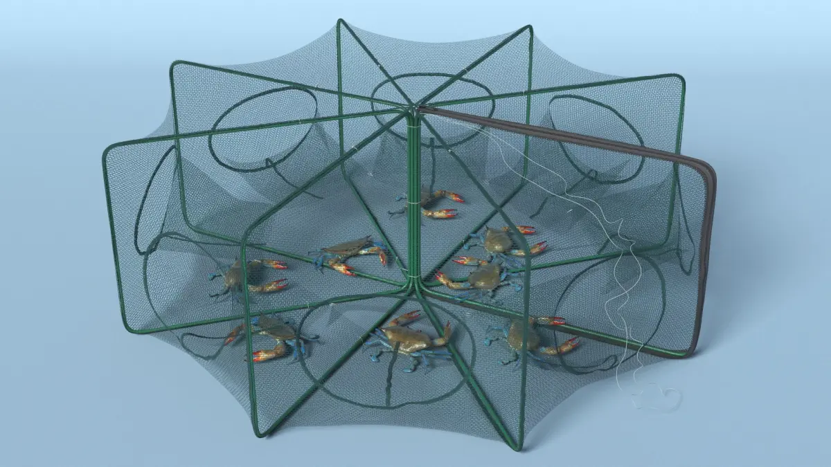 A foldable crawfish trap net with multiple entrances, ideal for trapping crawfishes efficiently. Its collapsible design allows for easy storage and transport, while the automatic pop-up mechanism ensures quick deployment. Suitable for use in saltwater and freshwater environments.