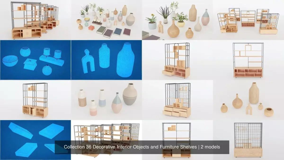 We present our impressive collection, which includes 5 modern wood and metal shelves and an exclusive pack of 31 decorative objects, designed to enhance any interior space. The shelves perfectly combine modern aesthetics, while the decorative set offers a varied selection of vases, pots, candles, bowls, plants, books, and more. Both collections are ideal for beautifying the virtual interiors of your 3D architectural projects.