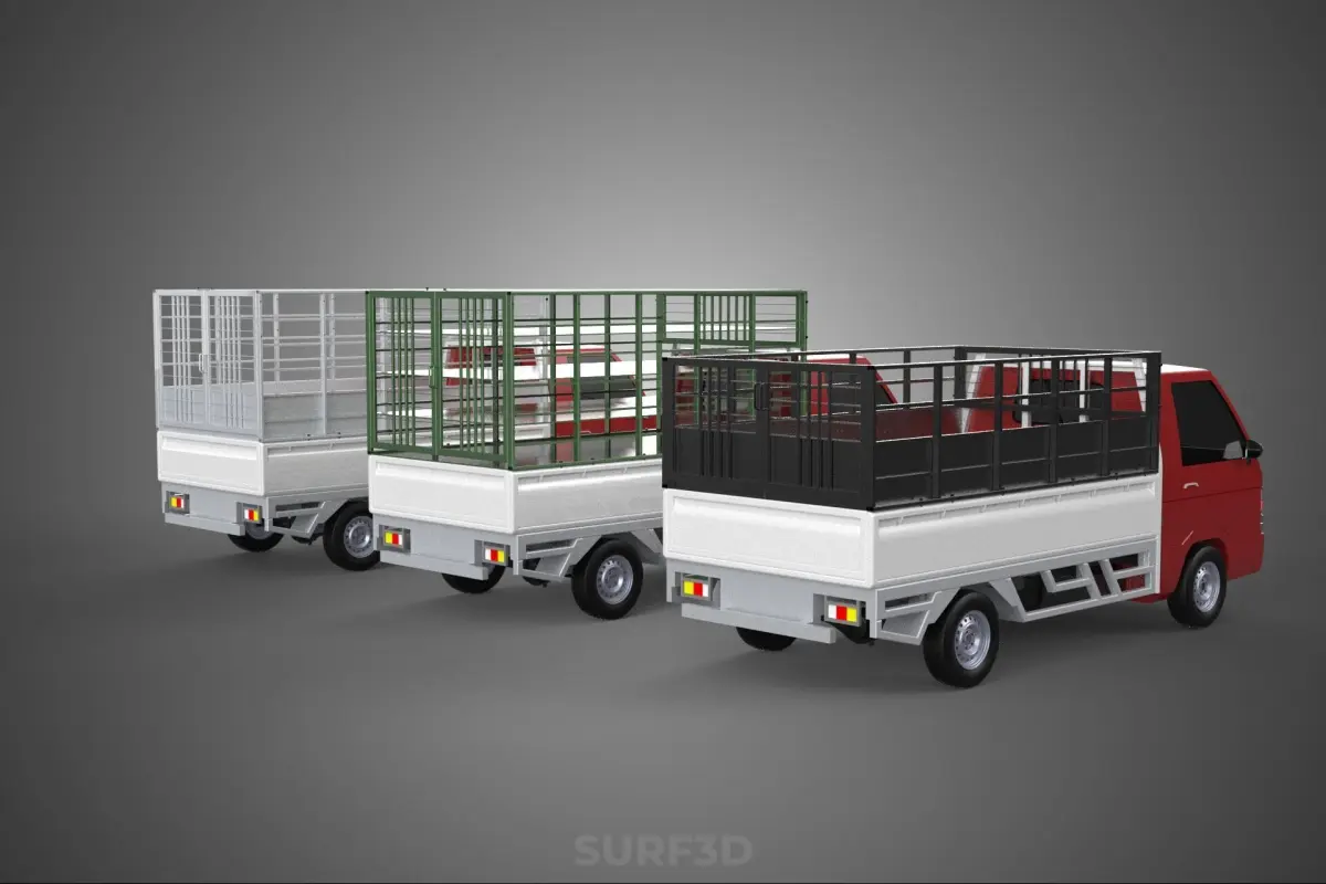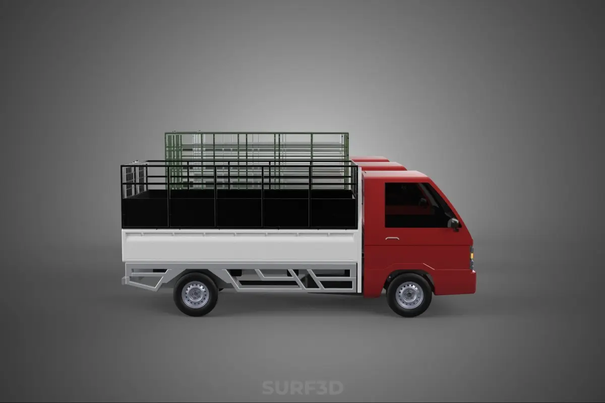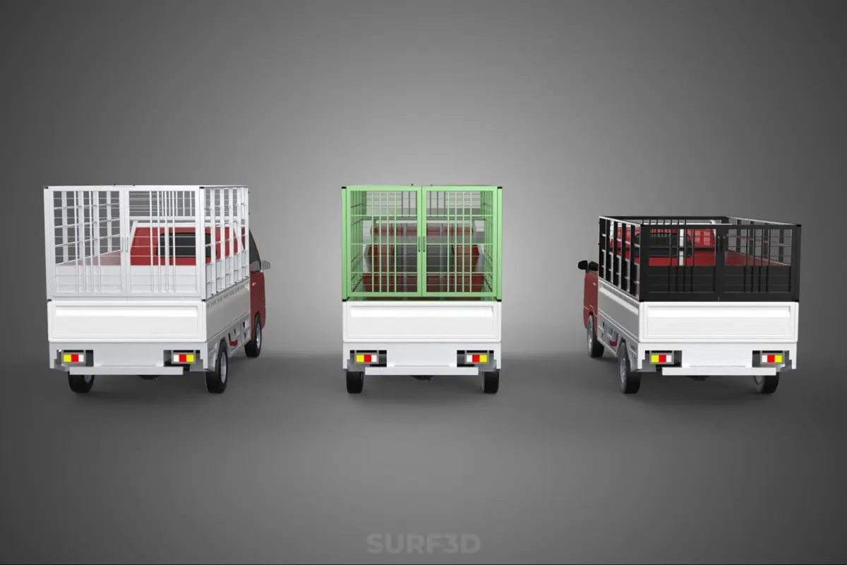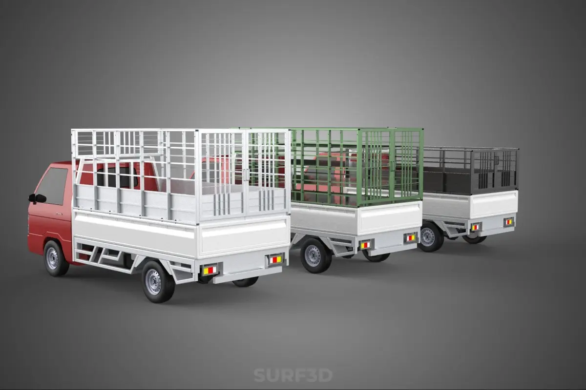 KEYWORDS: Pickup truck, agricultural vehicle, produce transport, vegetable transport, fruit transport, cargo cage, truck bed cage, farm truck, light commercial vehicle, agricultural logistics, harvest vehicle, crop transport, ventilated transport, bulk produce, market vehicle, local transport, farm-to-market, utility vehicle, open-sided cage, containment structure, produce hauling, rural transport, perishable goods, transport solution, vehicle modification, mesh cage, bar cage, rear body, collection vehicle, distribution vehicle.