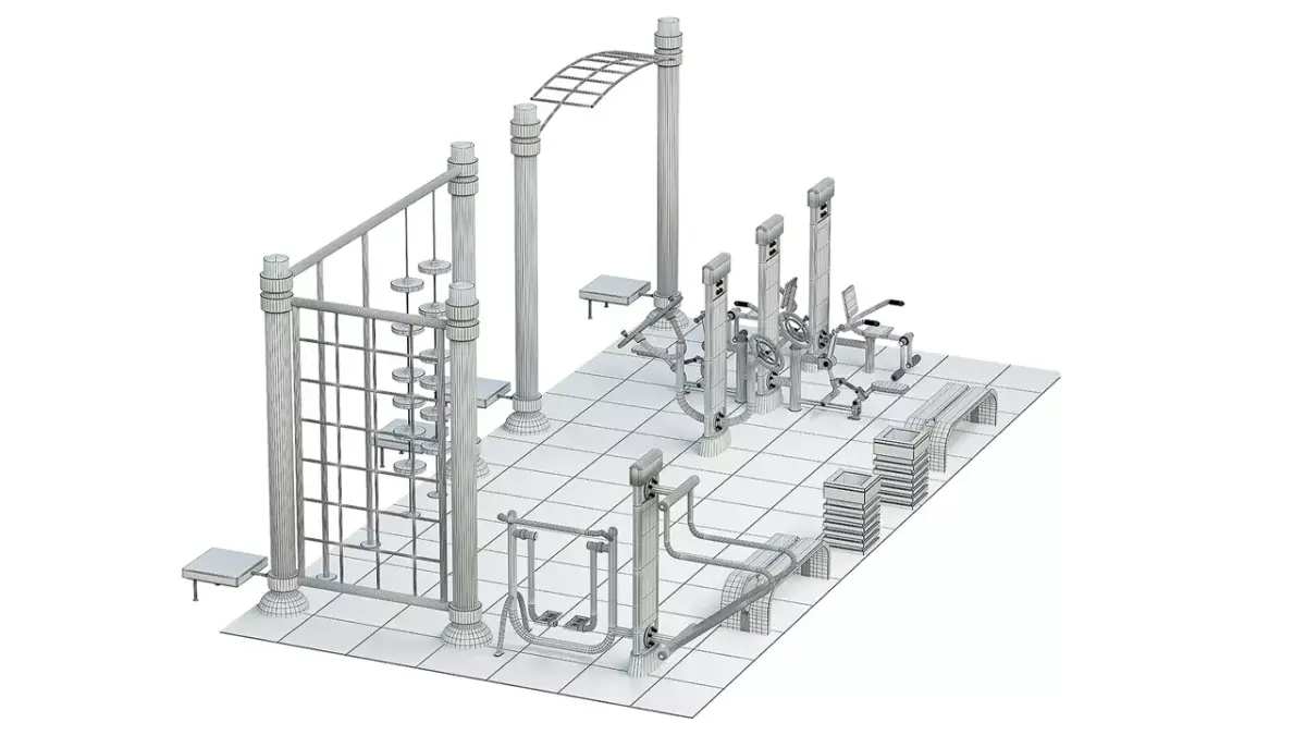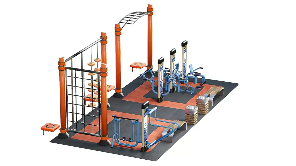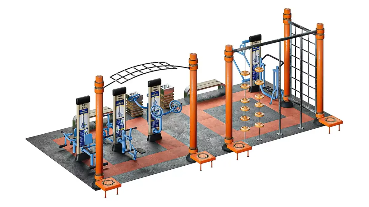 A complete outdoor exercise equipment complex for parks and courtyards: pull-up bars, parallel bars, ladders with rungs, arm, leg, and back exercisers, benches, a trash can, and rubber flooring. The area is built to actual dimensions.