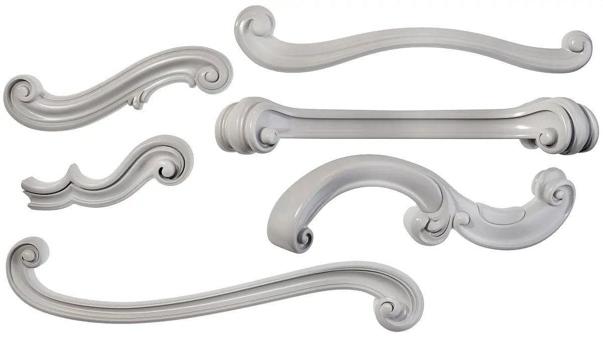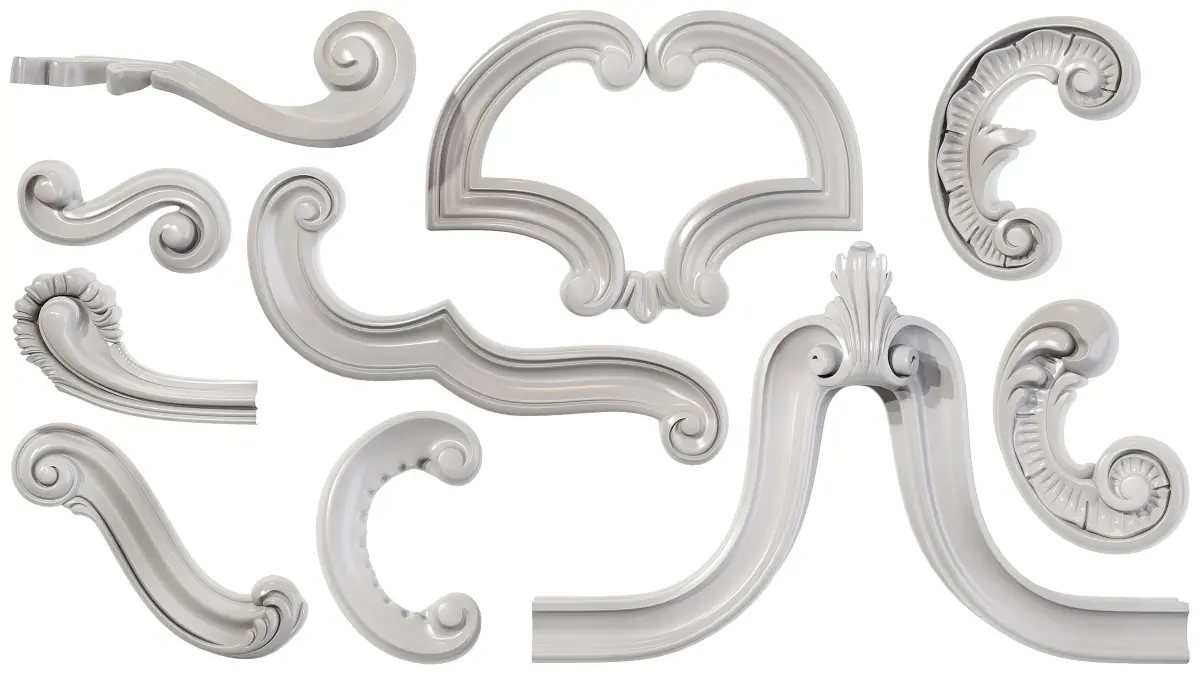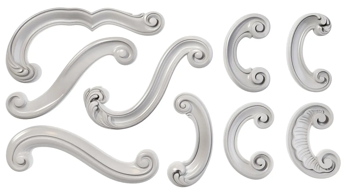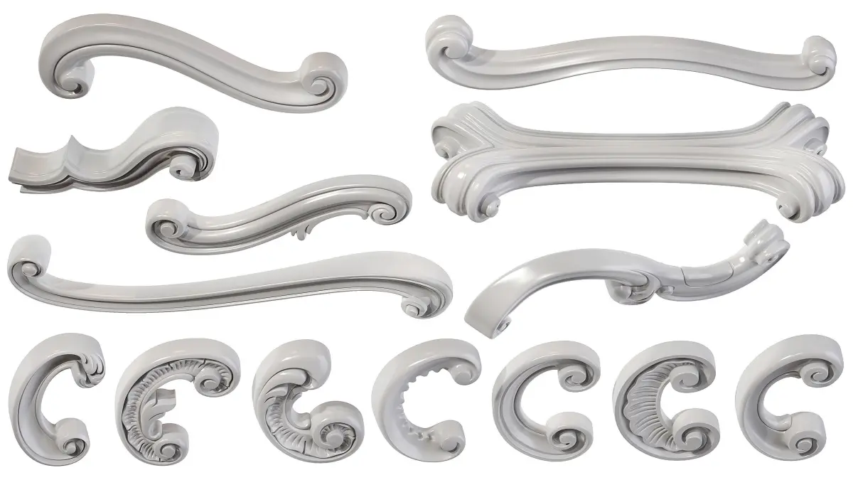 Ready to render detailed realistic 3d models of 25 swirl carved elements.