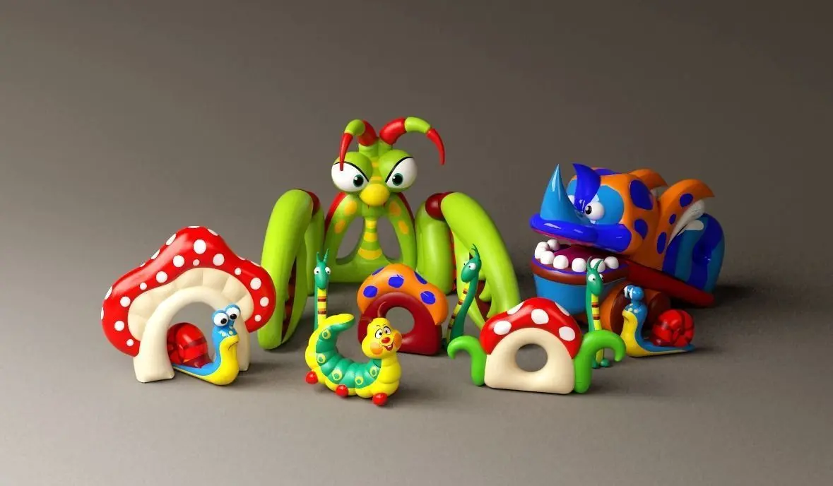 Collection of 3d models in cartoon style. This set contains 7 animal models. The collection includes: caterpillar, praying mantis, beetle, worm, snail, fly agaric house. 3d models are built in the Rhinoceros 3D program without the use of textures.