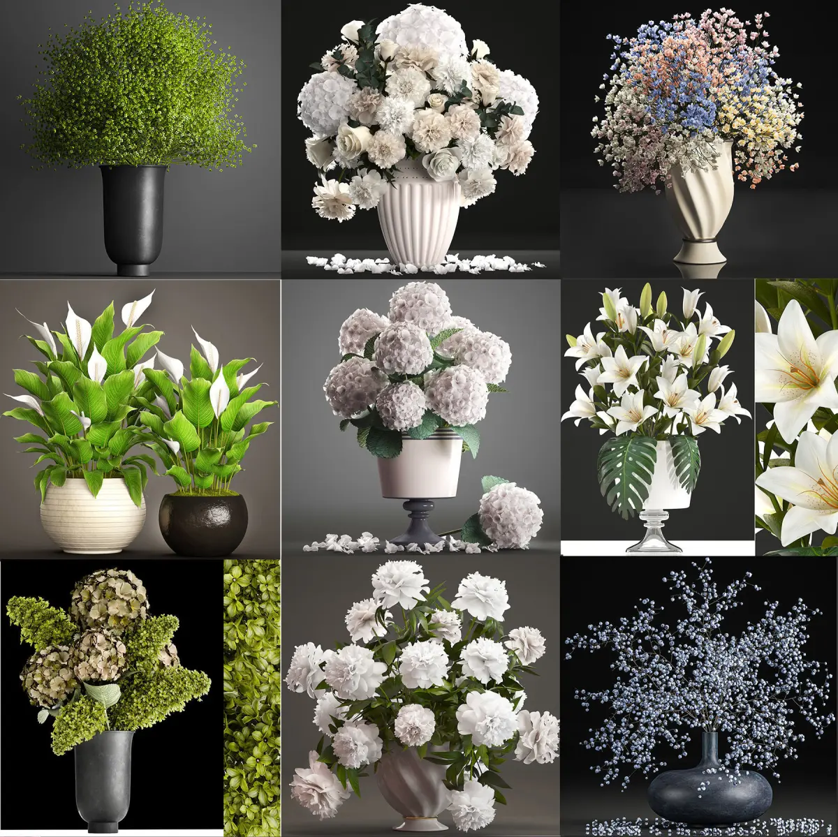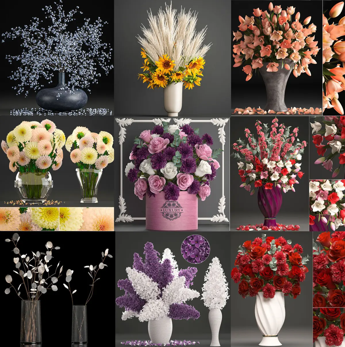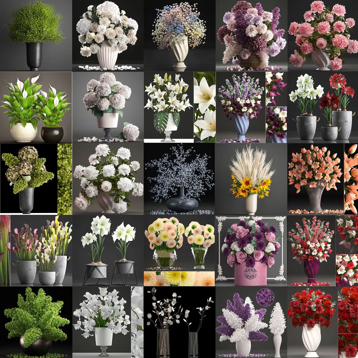 collection of bouquets 33 piecesDecorative bouquets of flowers in vases.Set of spring flowers.White bouquet of flowers, pink bouquet of flowers,Bouquet of green flowers, bouquet of red flowers, yellow flowers, purple flowers, bouquetDecorative bouquets.Bouquet for a celebration, wedding bouquet, table decoration, decor, set.Hydrangea, peonies, roses, lilies, lilac, Sarracenia, tulips, sunflower, Gypsophila, Hippeastrum, bouquet, bouquets, set, carnations, Spathiphyllum, Iris