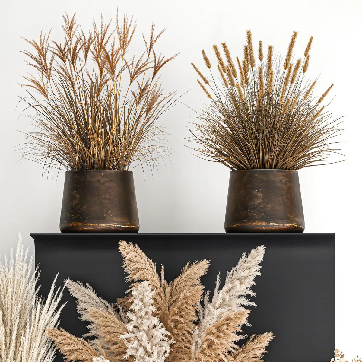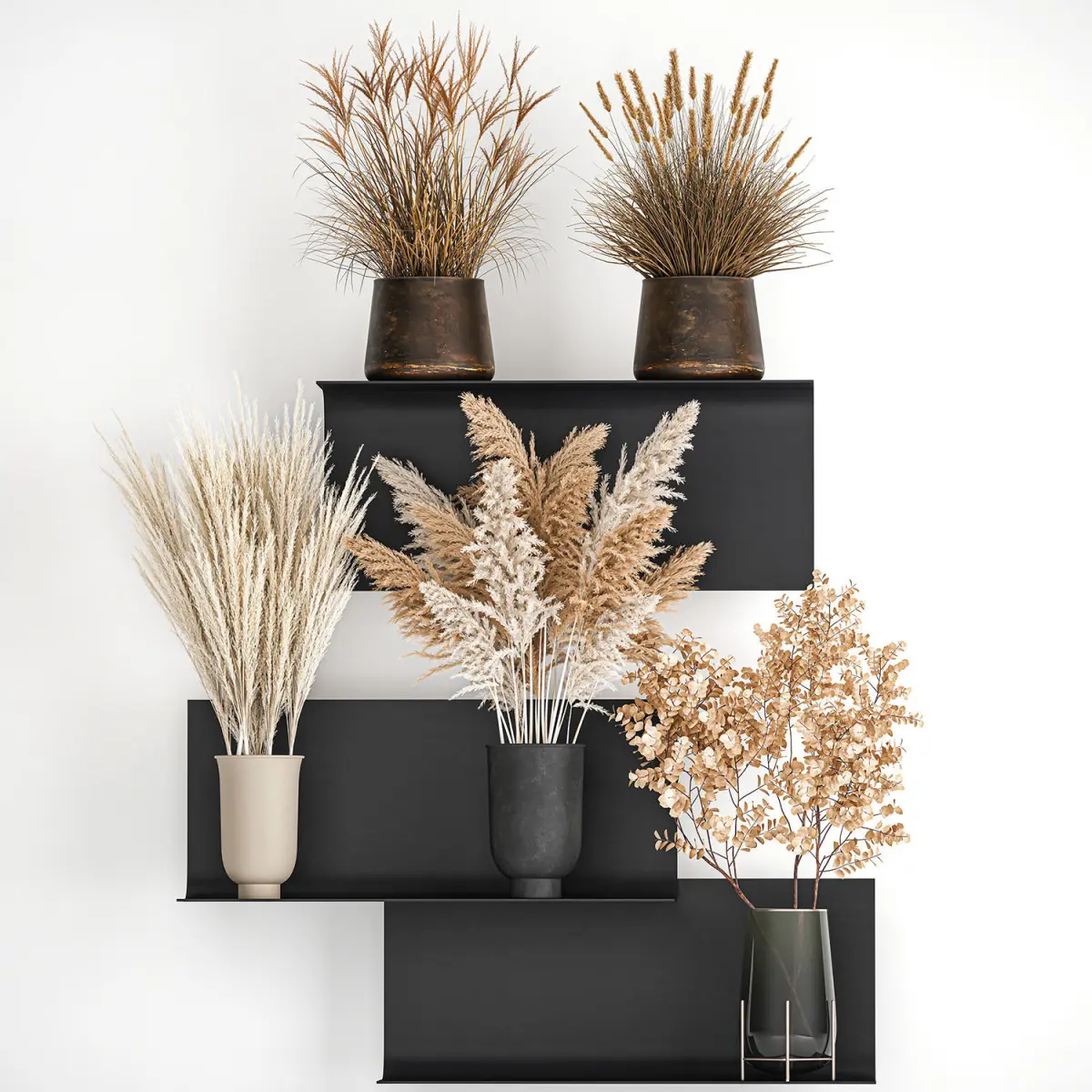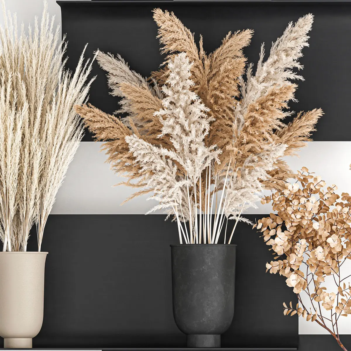 Decorative Bouquet of dry reeds in a vase for decor and interior design.Bouquet of dry bleached flowersShelf with bouquets of flowers - sfoglia, bellavista piccini, moggVase - MENU CYCLADES VASELarge: 260mm H x 140mm DPhragmites australisDry reed - Dry white reed.Dried flowers, dry grass.dry, stabilized, paintedCortaderia, pampas, pampas grass.Dried flowers decor - branches, pampas grass.Eucalyptus cinerea