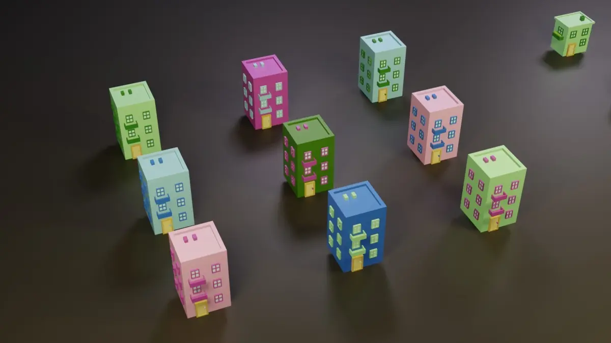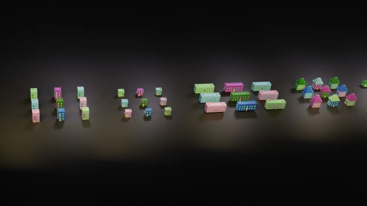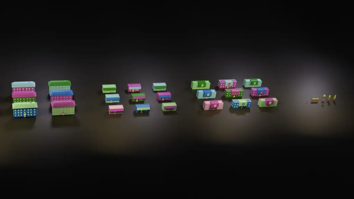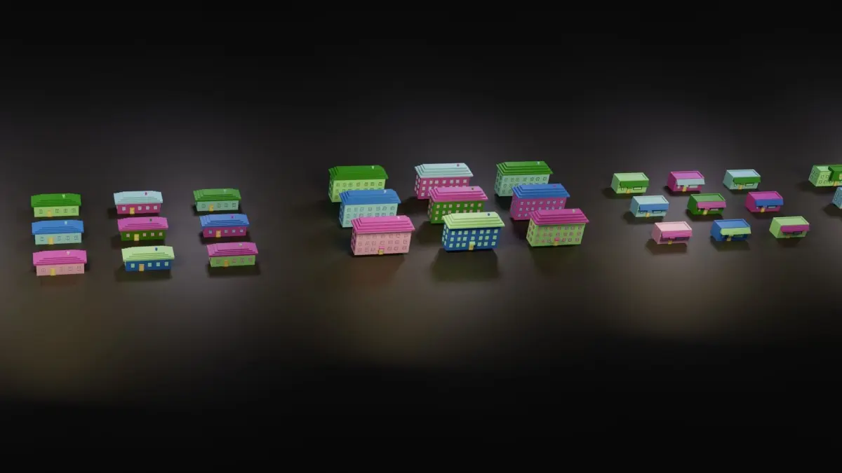 This pack contains 8 unique house models and 5 types of potted trees.