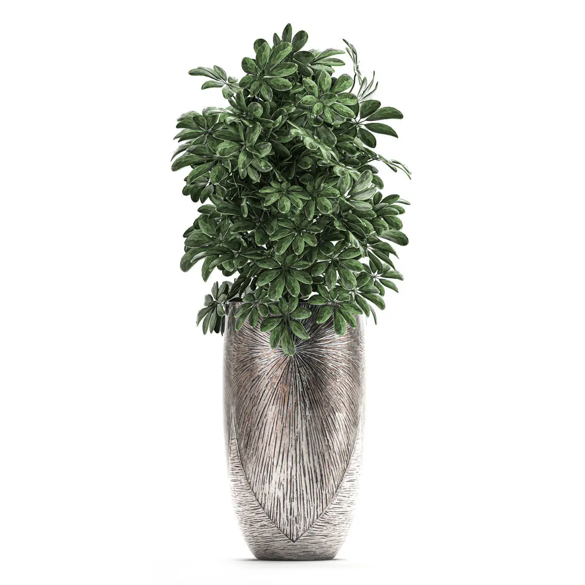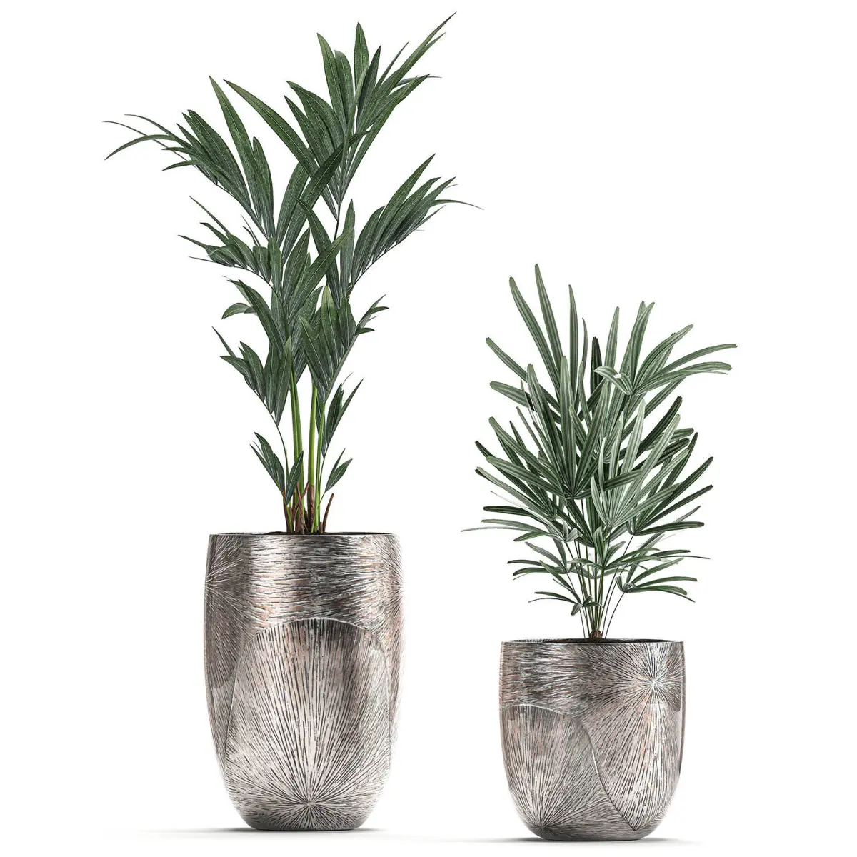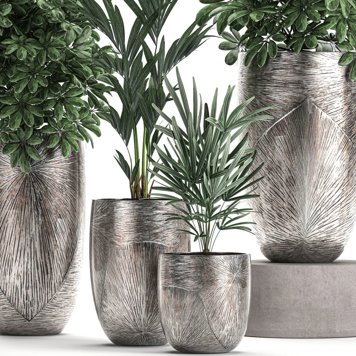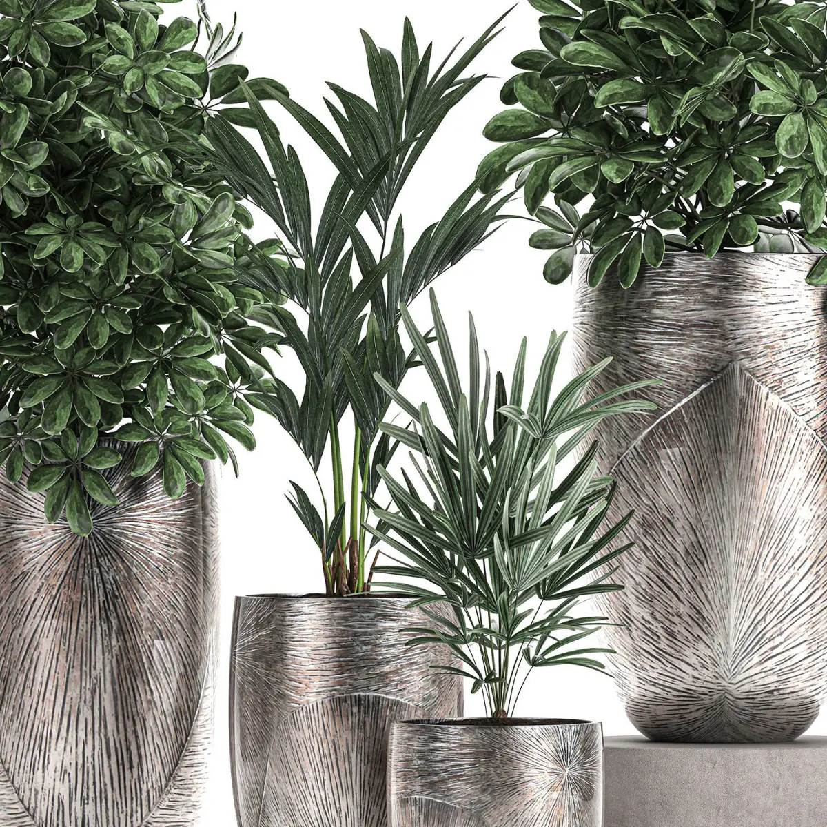 Ornamental plants for the street and interior in luxury flowerpots.Houseplantsexotic plantsTropical plants in potsluxury, silverScheffleraHowea forsterianaDate palmRaphis Palm, Rhapis excelsa