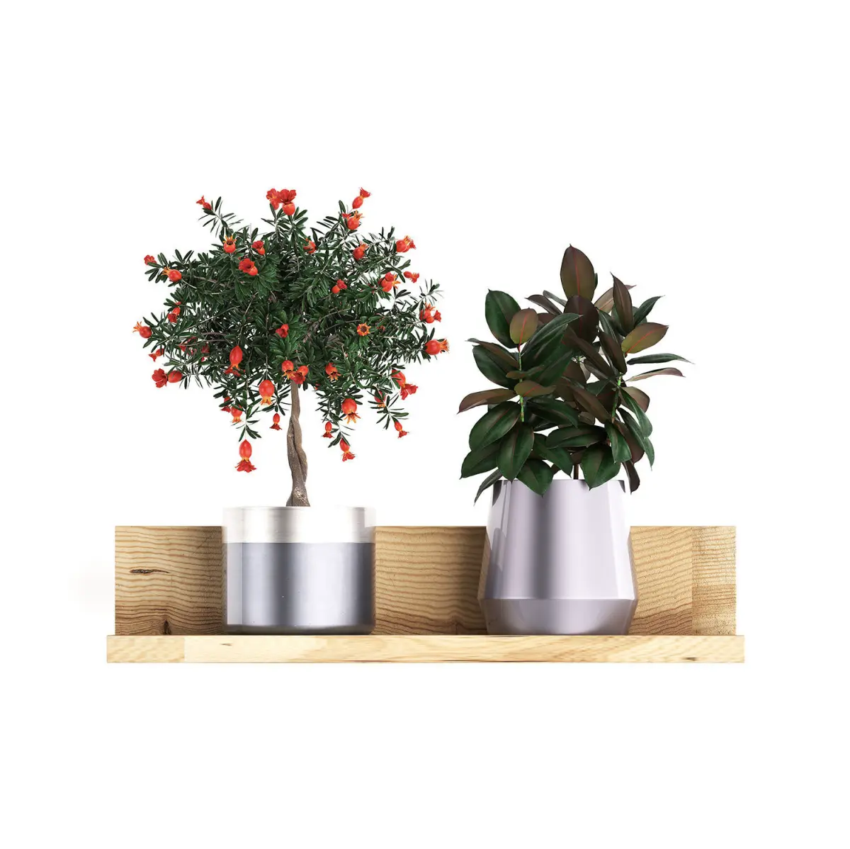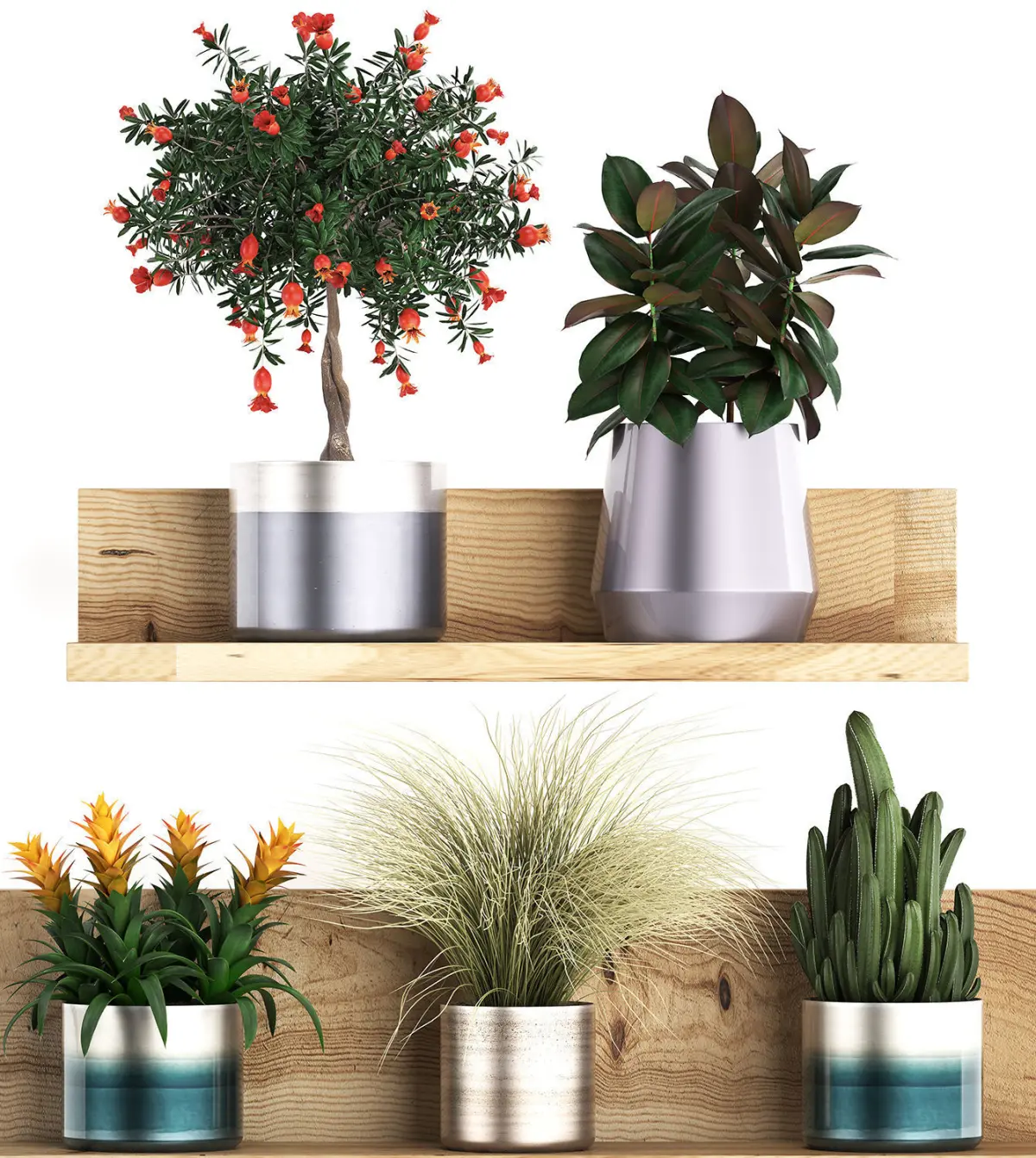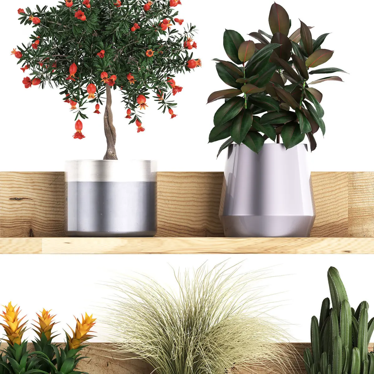 Houseplantsexotic plantsDecorative palm tree in a pota shelfwooden shelfshelf with flowersdecorative plantsbromeliaFicus elasticaFicus robustaTussockGrassPomegranate treeCereus repandusCactus