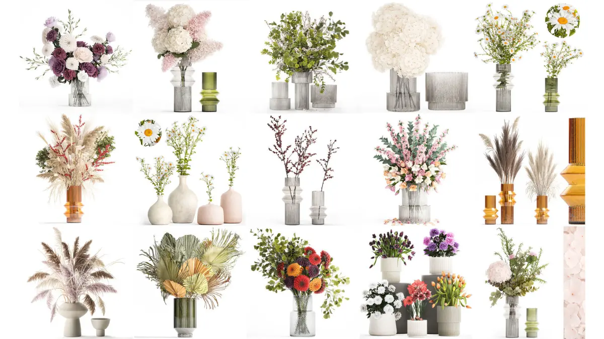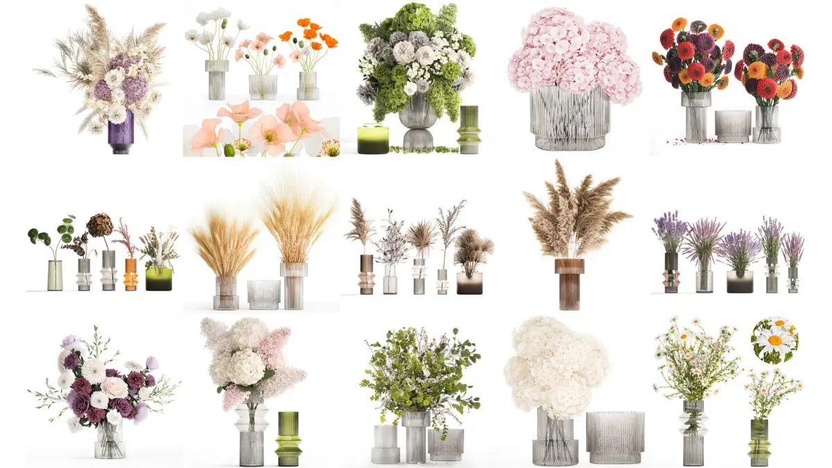Collection of flower bouquets set of 36 piecesModern glass vases and realistic flower bouquets.Bouquet of white flowers, red flowers, pink bouquet, multi-colored bouquetsSpring bouquethydrangeaBouquet of tulipsPaeonia, peonySyringa, lilacThistleIlex, HollyHeracleumLavandula, lavenderBerberis, BarberryDianthus caryophyllusCarnationRoseHippeastrumchrysanthemum, golden-daisyyellow flowersBouquet of cherry blossoms, sakuraBouquet of dried pampas flowersMatricaria, chamomile, daisiesPapaver, nudicaule, Hollow-stem poppy, Icelandic poppy, poppyTriticum, spikeletHippeastrumbouquet of dried flowers, huge, big, mega, the bestbridal bouquet, wedding flower decorcortaderia, pampas bouquet, reed grass, dryBouquet of dry palm leaves