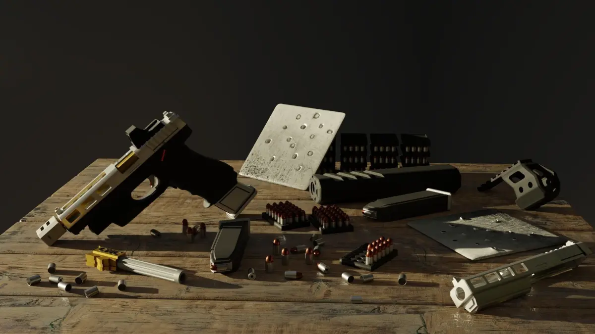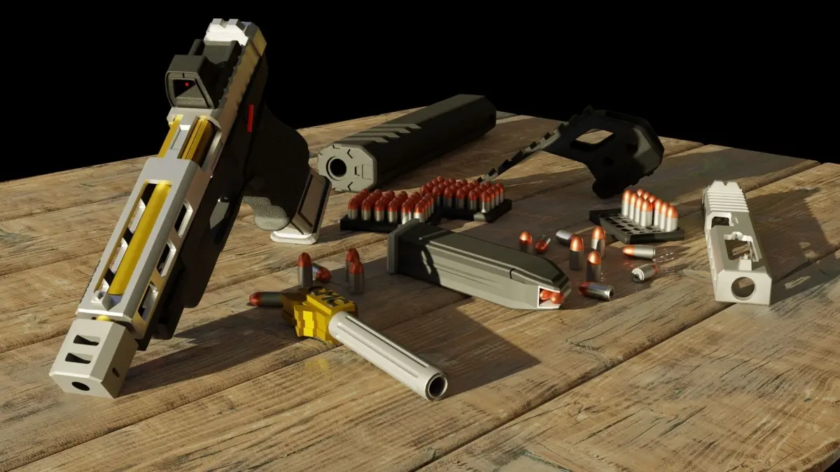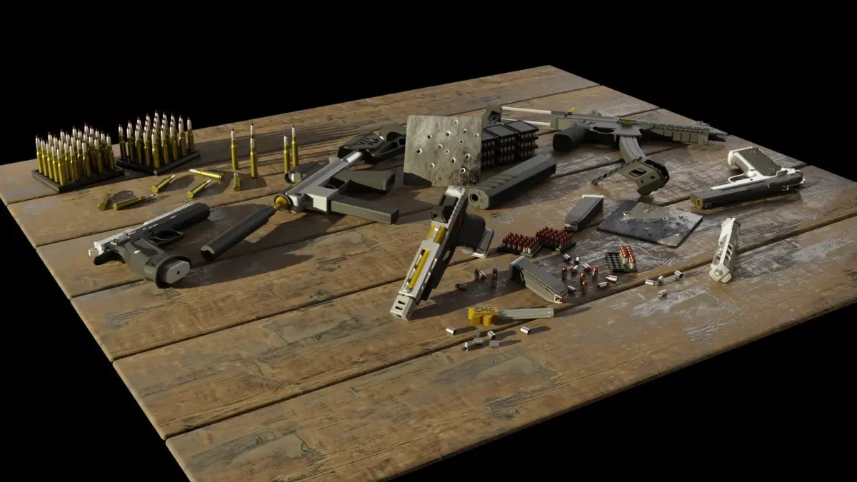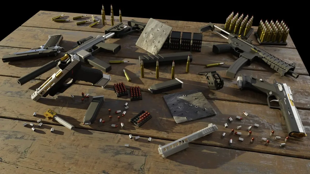 This is scene with collection of modeled guns, SMG rifles and a sniper rifle on wood table.