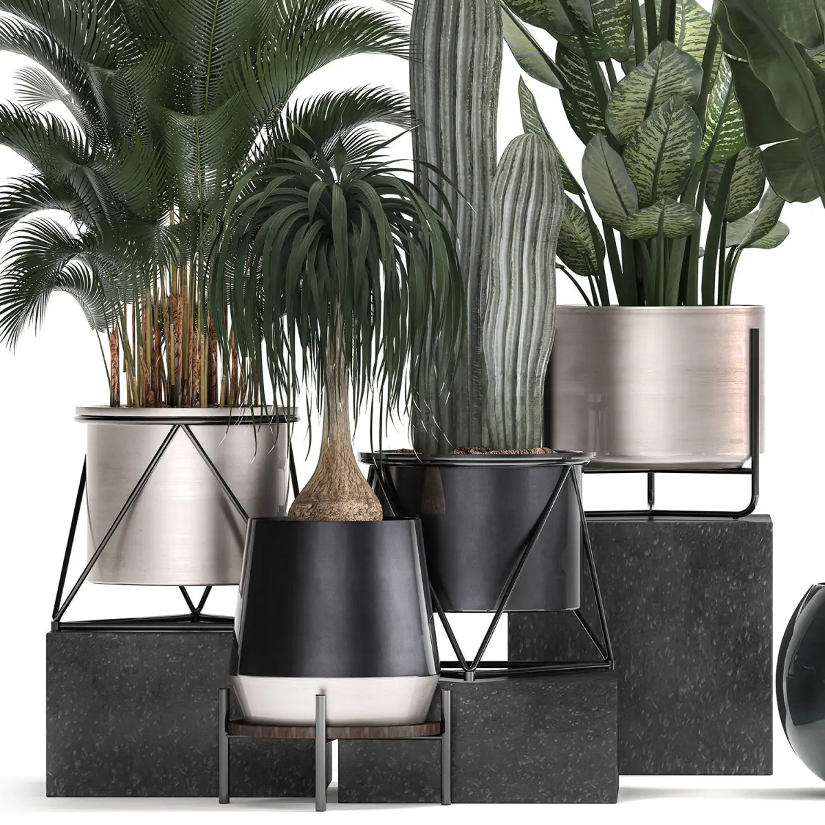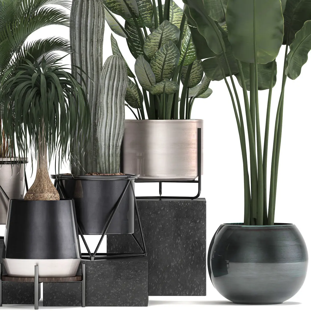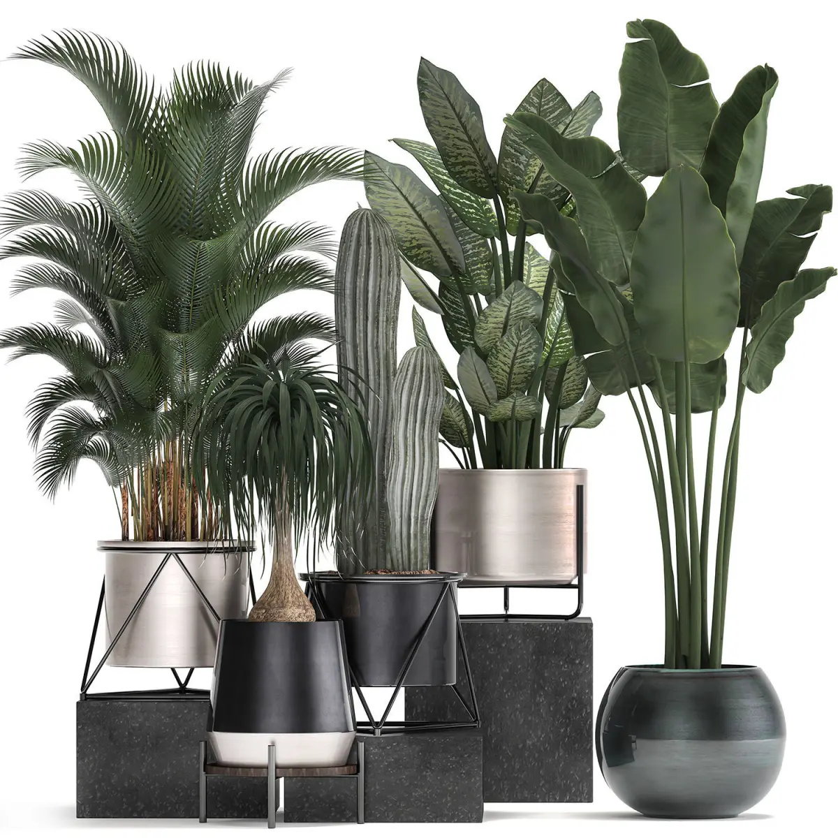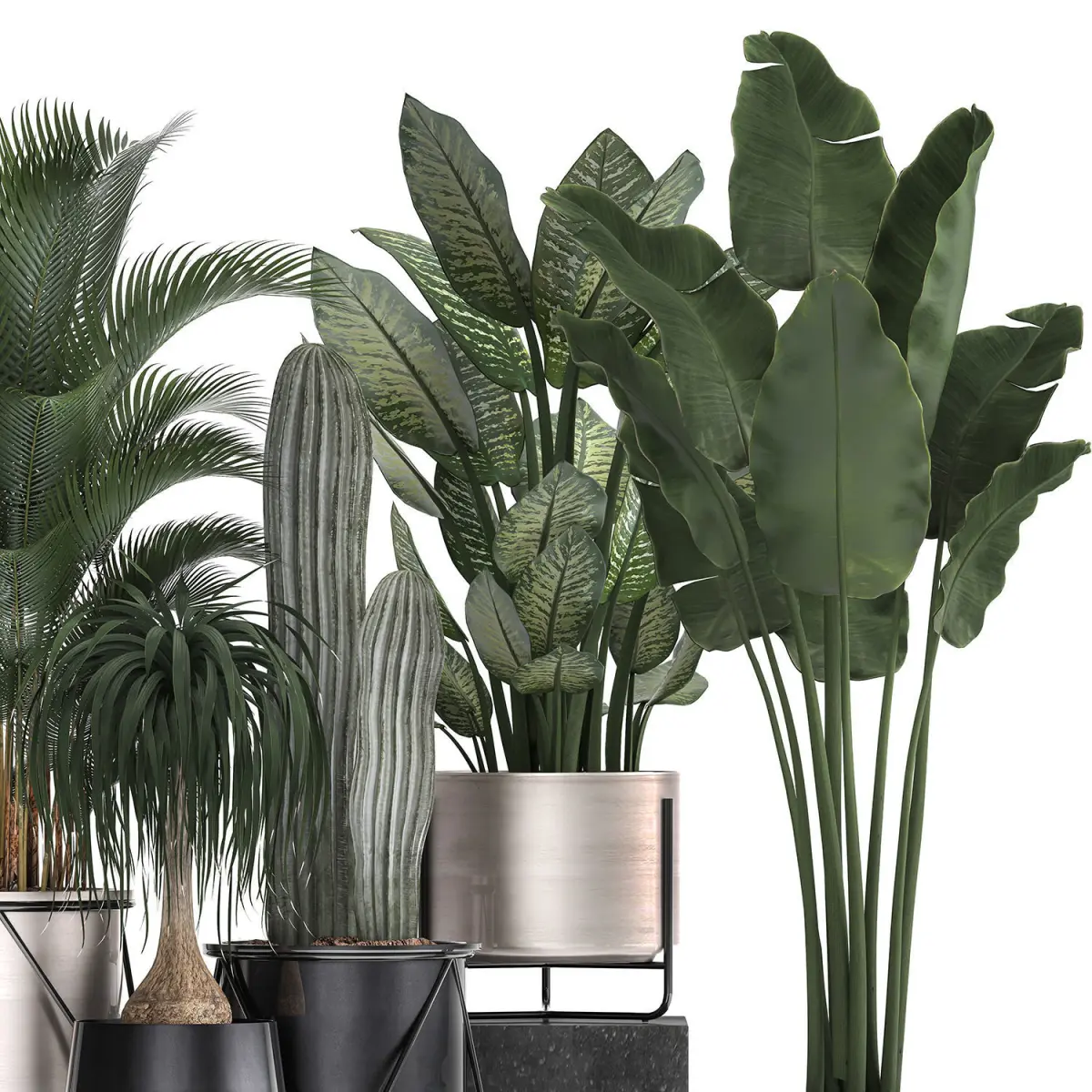 Decorative plants for the street and interior in metal pots, luxury pot.indoor plantsHouseplantsexotic plantstropical plantsHowea forsteriana - Howea, Kentia, ornamental, house palm.Column Cactus, Saguaro Cactus - cactus, indoor cactus.DieffenbachiaDracaenaDracaena, pot, black flowerpotbanana palmRavenala madagascariensisStrelitzia
