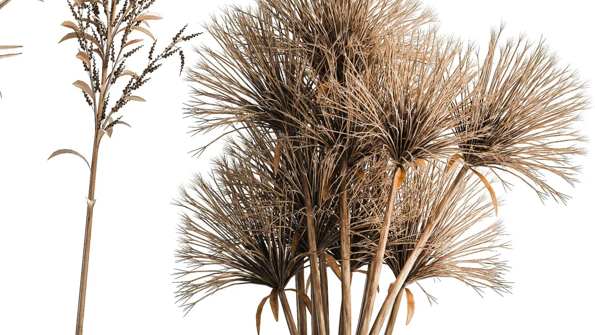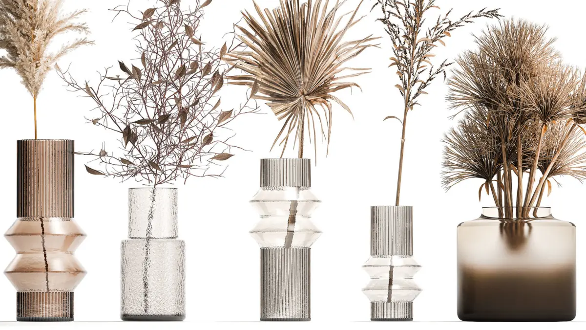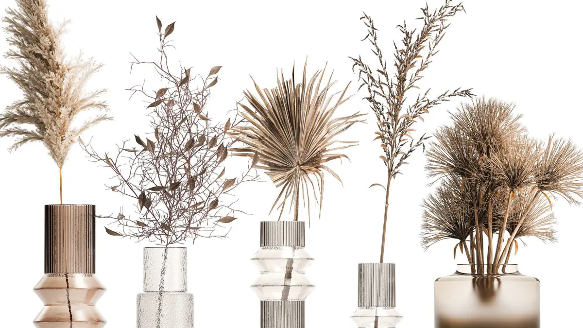 Collection of minimalist bouquets of dried flowers, pampas vase